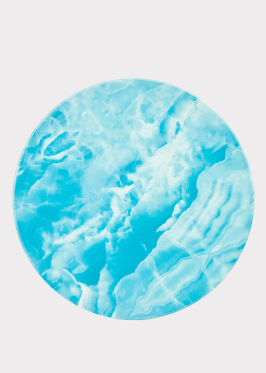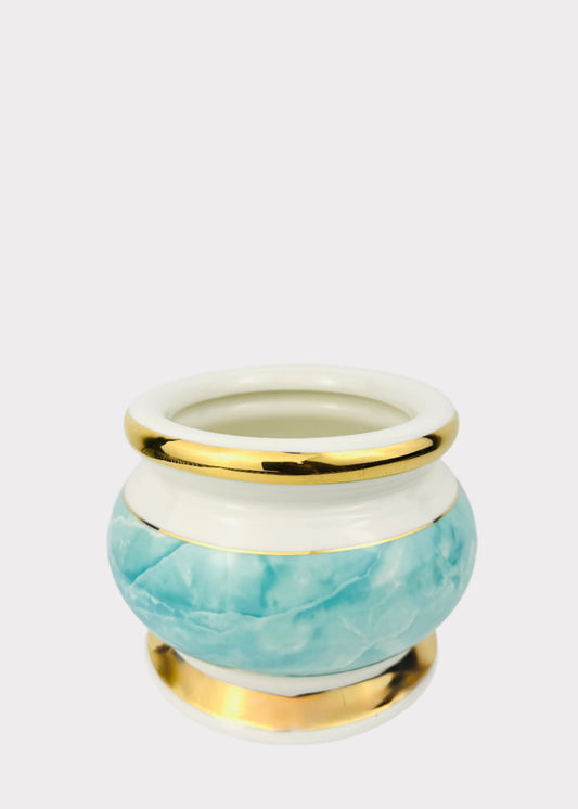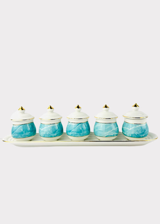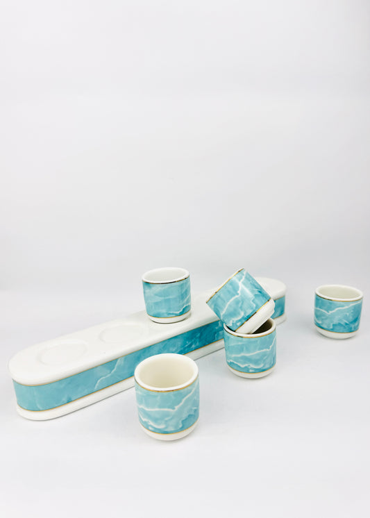 Blue Marble Covered Offering Cups Set - 5 Cups - Oval Tray - Gold Rim