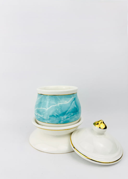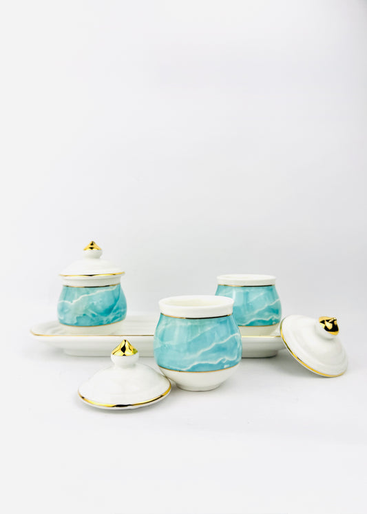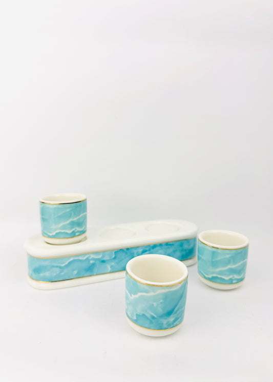Blue Marble Covered Offering Cups Set - Oval Porcelain Tray - Gold Accents - 3 Cups