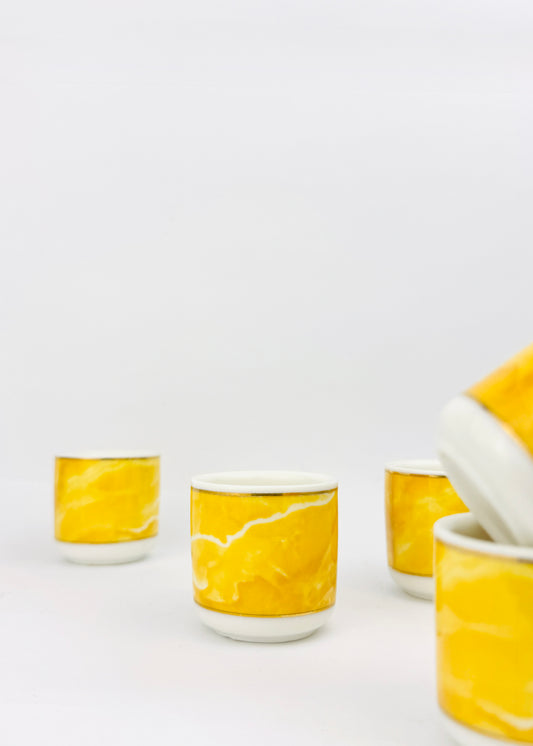 Yellow Marble Covered Offering Cups Set - 5 Cups - Oval Tray - Gold Rim