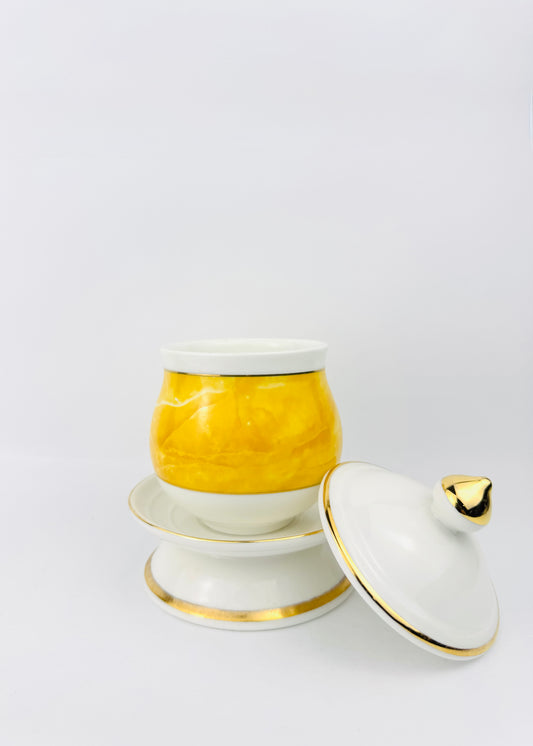 Yellow Marble Covered Offering Cups Set - Oval Porcelain Tray - Gold Accents - 3 Cups