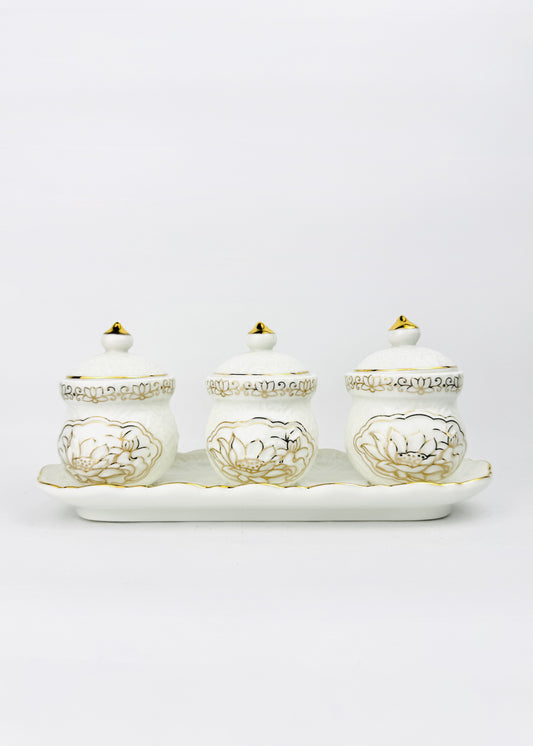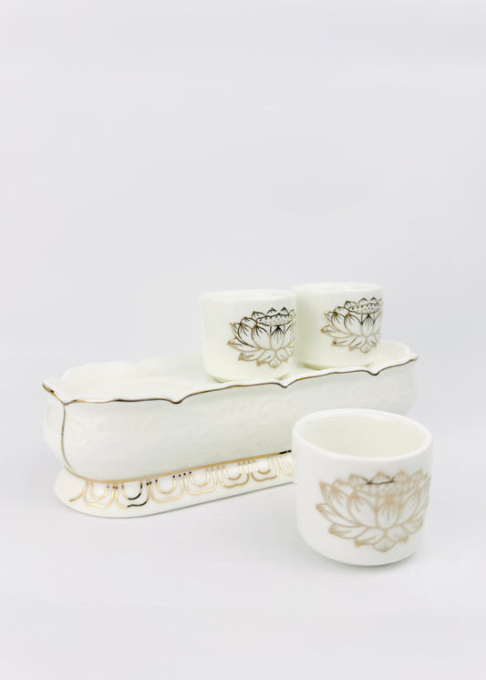 Lotus Linework Offering Cups - Raised Base Tray - White Porcelain Gold - 3 Cups