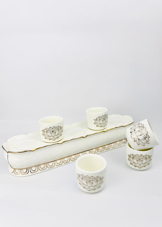 Lotus Linework Altar Offering Cups Set - Raised Base Tray - White Porcelain Gold - 5 Cups