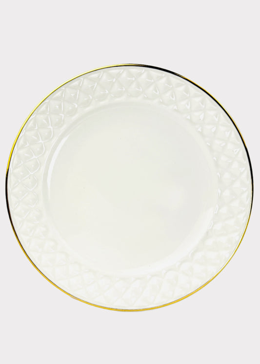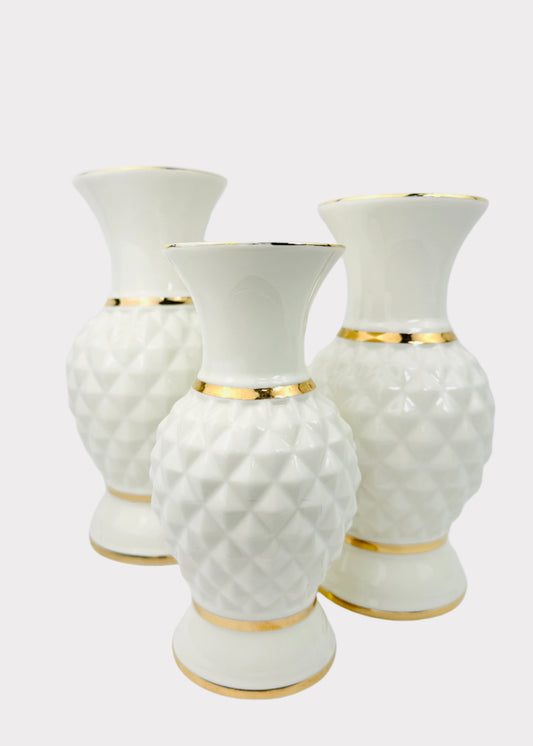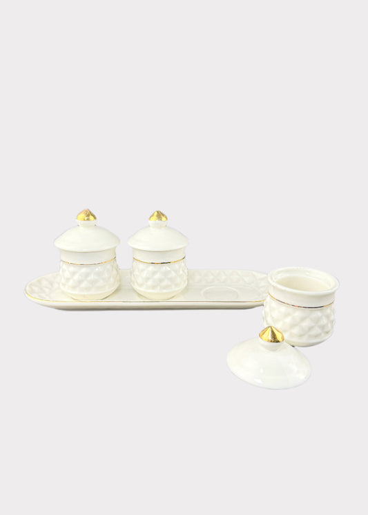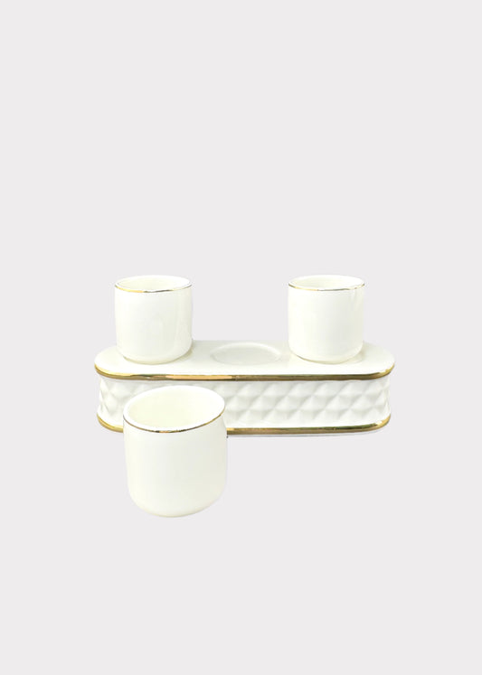 White Diamond-Texture Covered Offering Cups Set - Oval Porcelain Tray - Gold Accents - 3 Cups