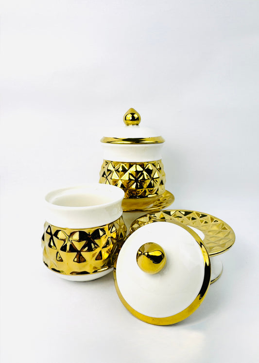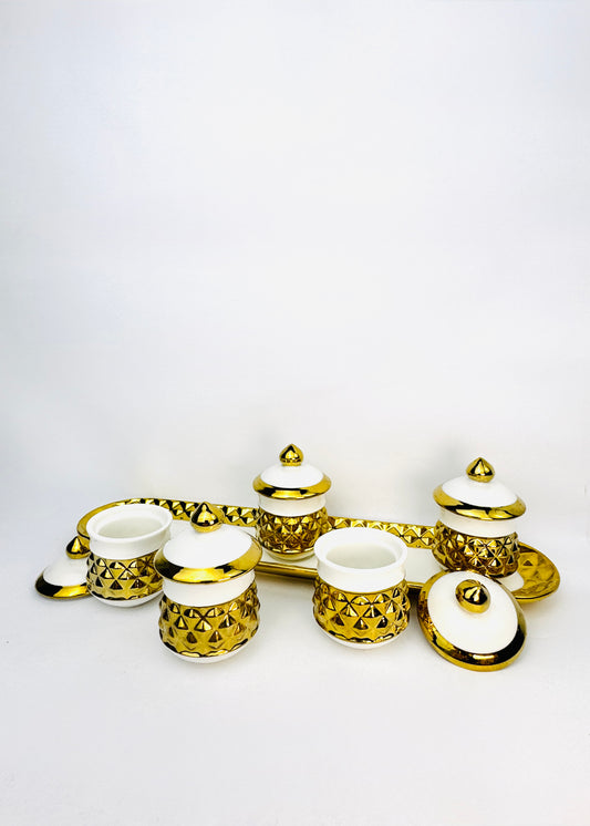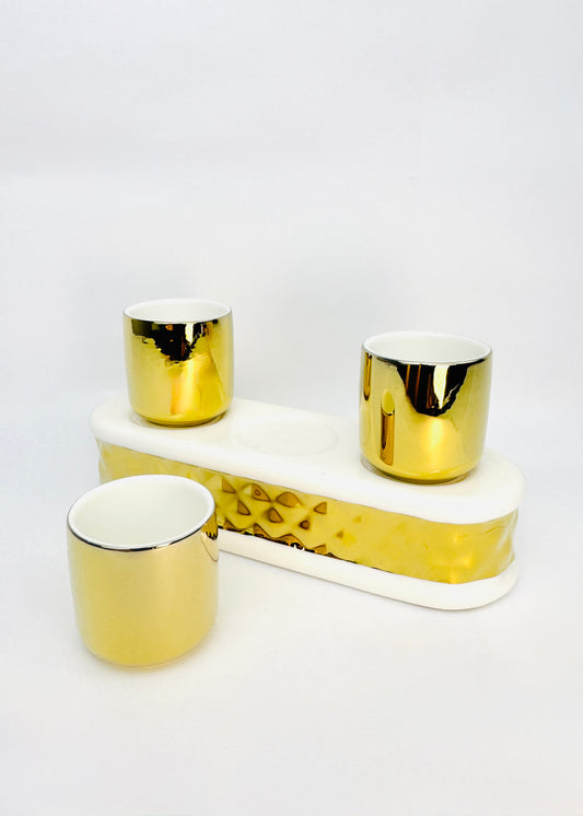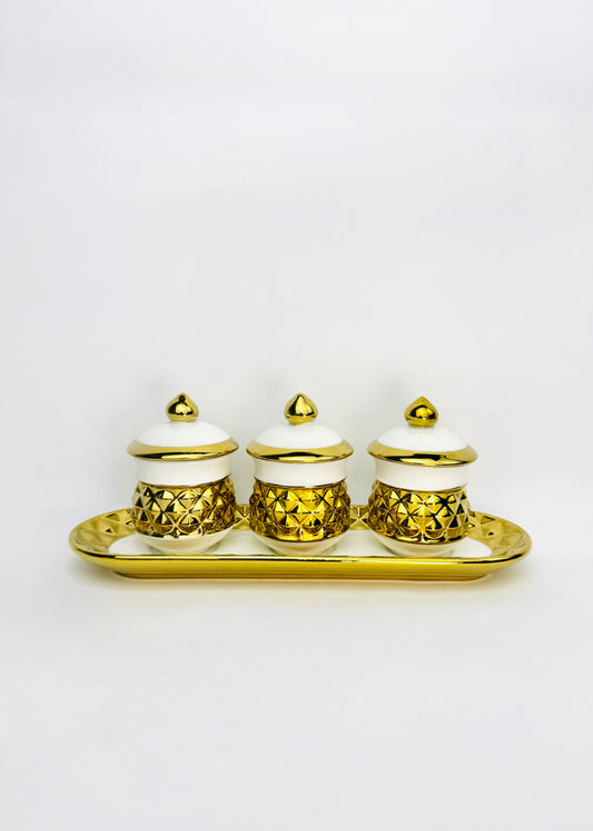 Gold Faceted Covered Offering Cups Set - Oval Tray - White Porcelain - 3 Cups