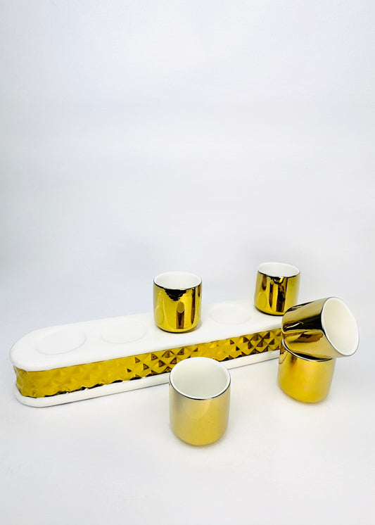 Gold Diamond-Cut Covered Offering Cups - 5 Cups - Oval Tray - Porcelain