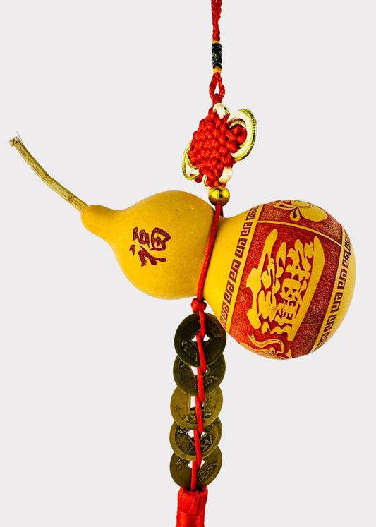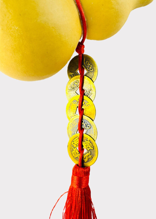 Natural Hulu Gourd with 5 Coins - Feng Shui Health and Wealth - Red Tassel