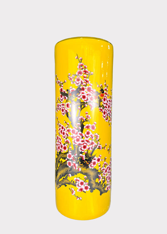 Porcelain Cylinder Vase – Hand Painted Cherry Blossom and Peony – Tall Ceramic Décor