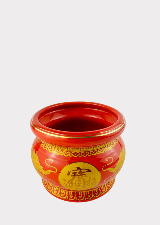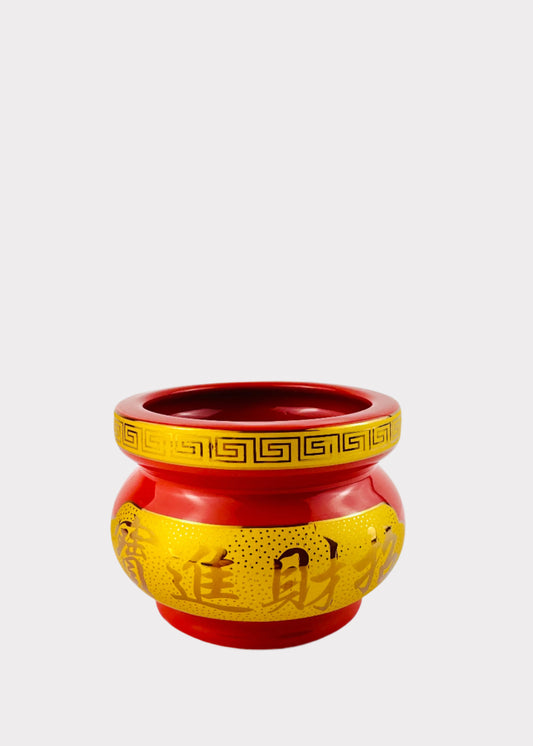 Prosperity Script Red – Incense Holder Pot with Yellow Band – Ceramic