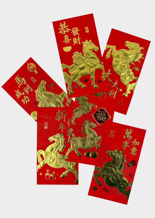 Golden Horse Red Envelopes - 6 Textured Gold Foil Designs