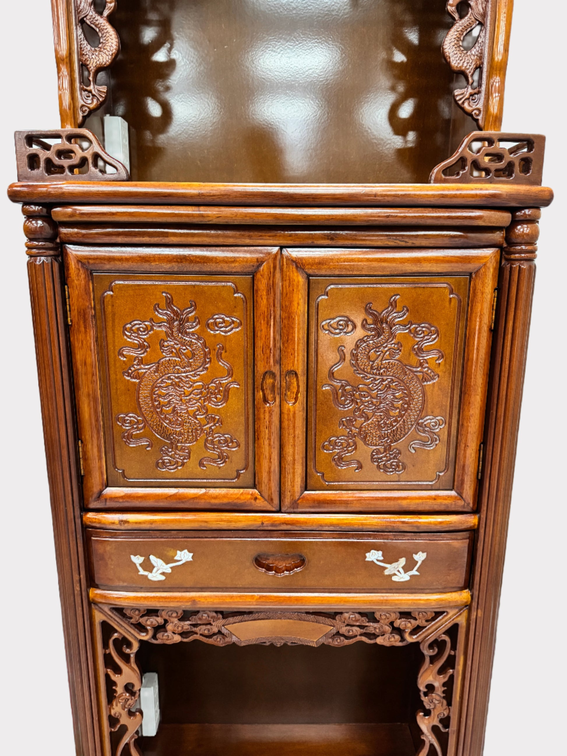 Enhance your sacred space with our beautifully crafted yellow tan plywood altar, designed for both elegance and functionality. This altar features a central cabinet adorned with intricate twin dragon emblems, symbolizing strength, prosperity, and protection. Each tier, except for the middle cabinet, includes a built-in Medium Screw (E26) socket for lighting, along with additional outlets for powering extra lights or essential altar accessories. Thoughtfully designed for convenience and spiritual devotion, this altar seamlessly blends traditional craftsmanship with modern practicality, making it a perfect addition to any home or temple setting.