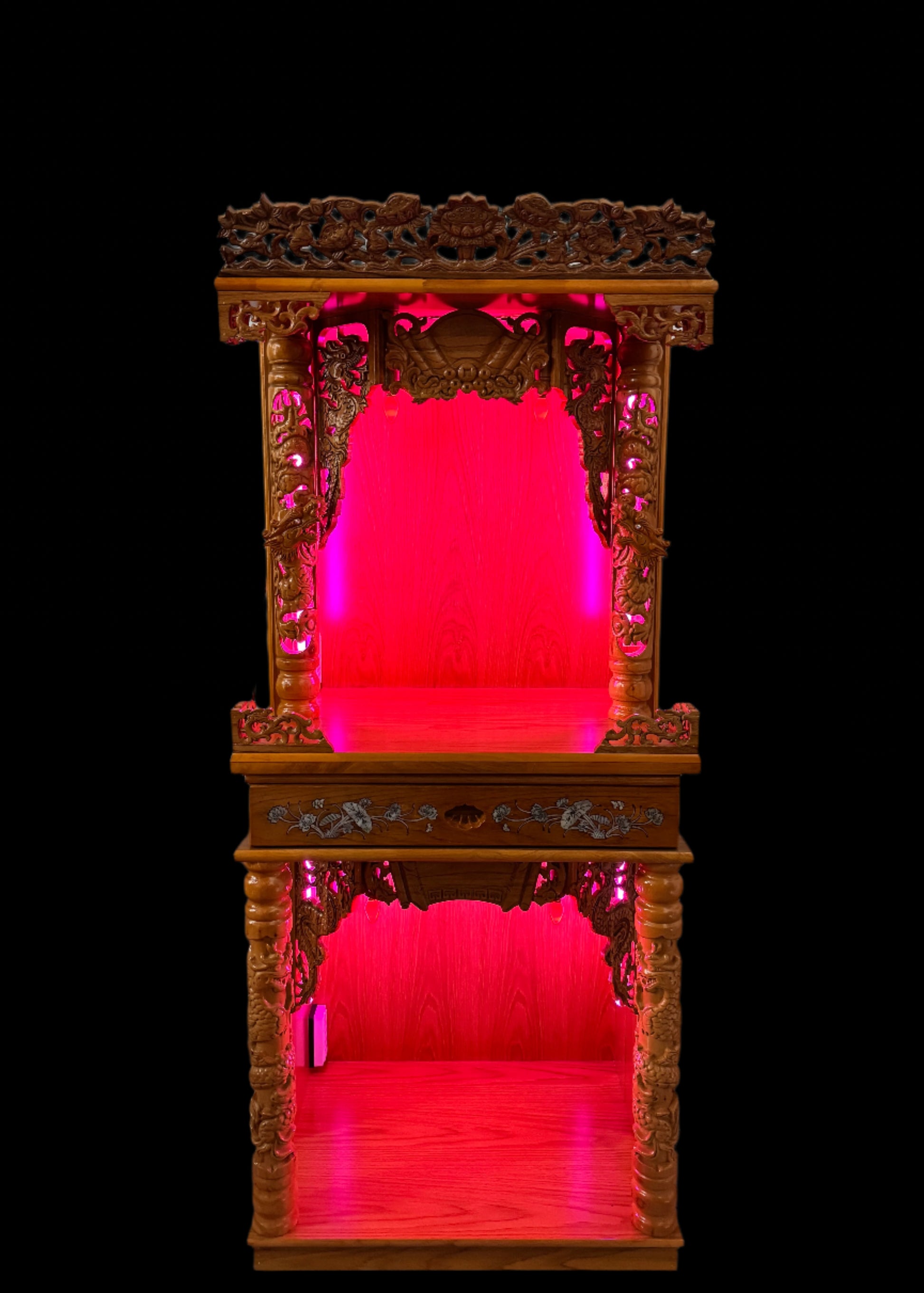 This altar now features a two-tier structure, providing ample space for arranging deities, offerings, and sacred items. At the center, a sliding drawer offers a convenient storage solution for incense, altar tools, or other ritual essentials, ensuring easy access while maintaining a clean and organized space.