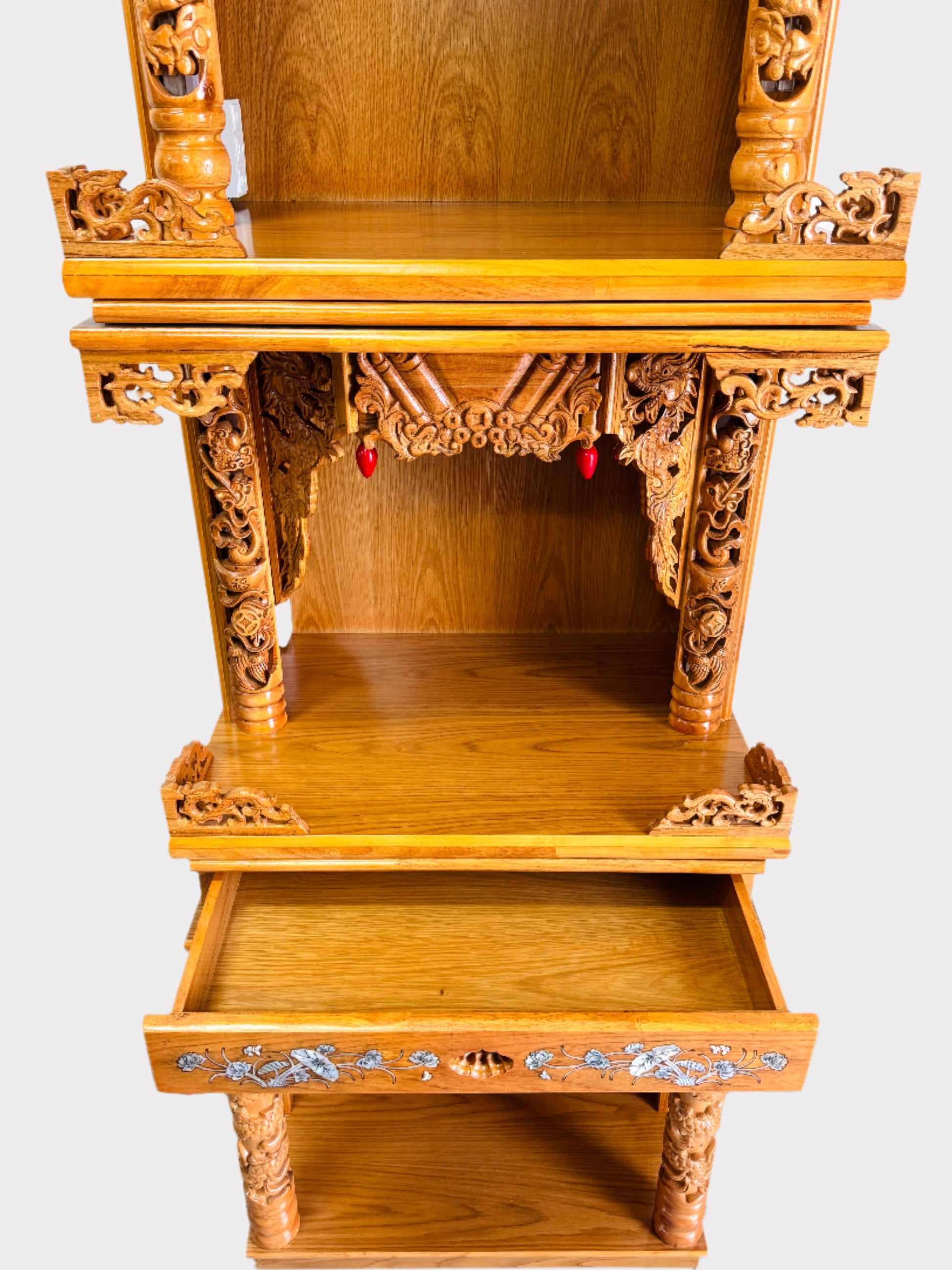 For added convenience, the altar includes a sliding board extension, offering extra space for incense, offerings, or ritual use. Finished with elegant metal pulls and handles, this altar seamlessly blends traditional artistry with modern functionality.