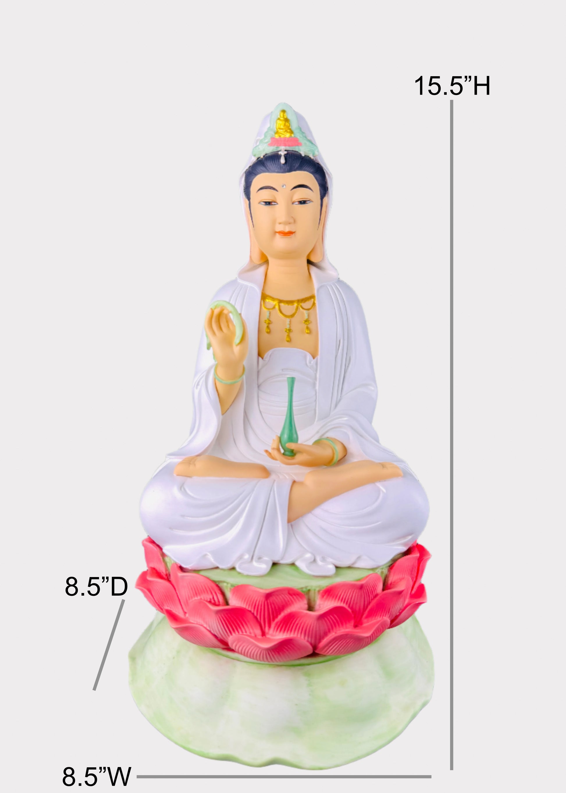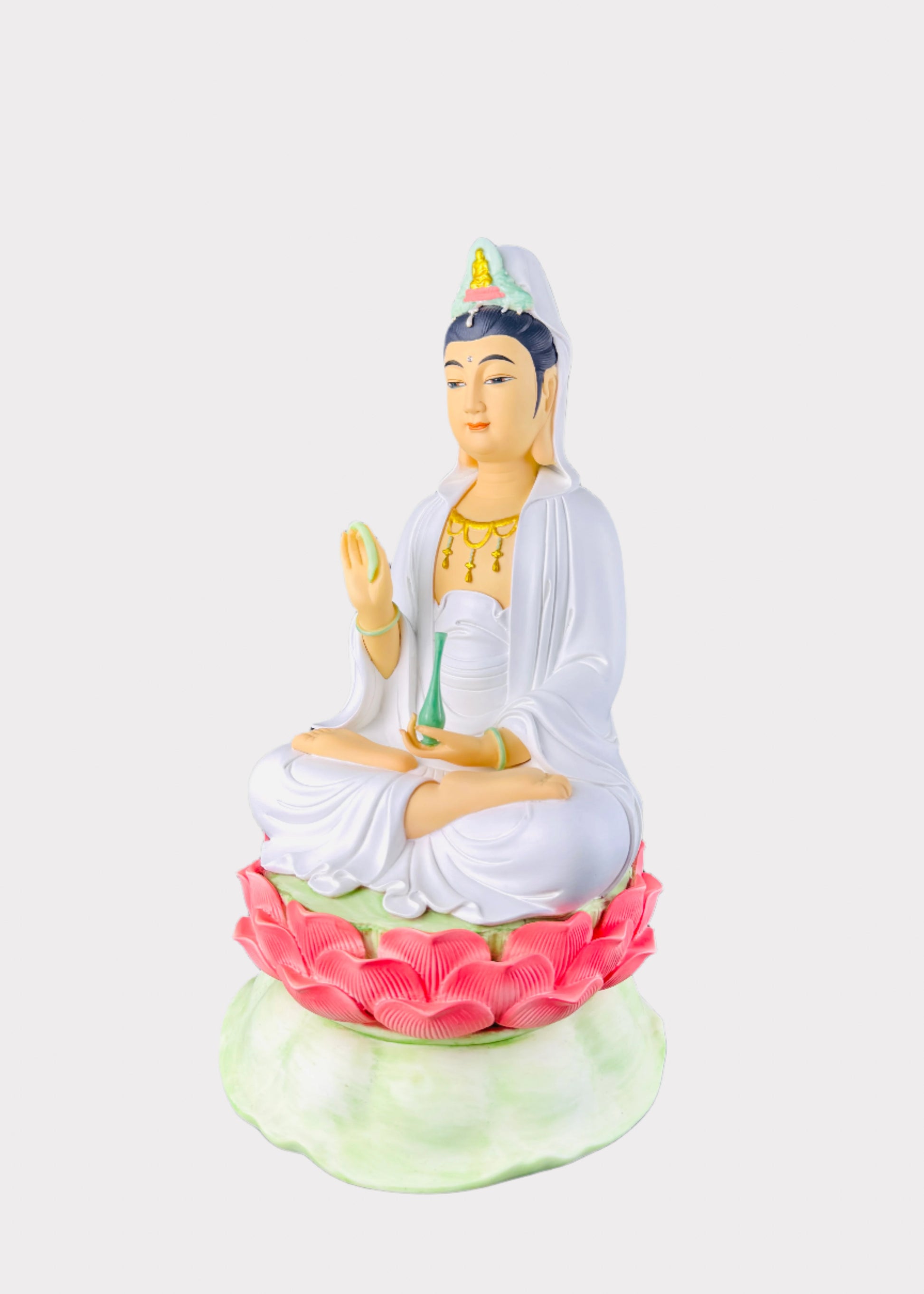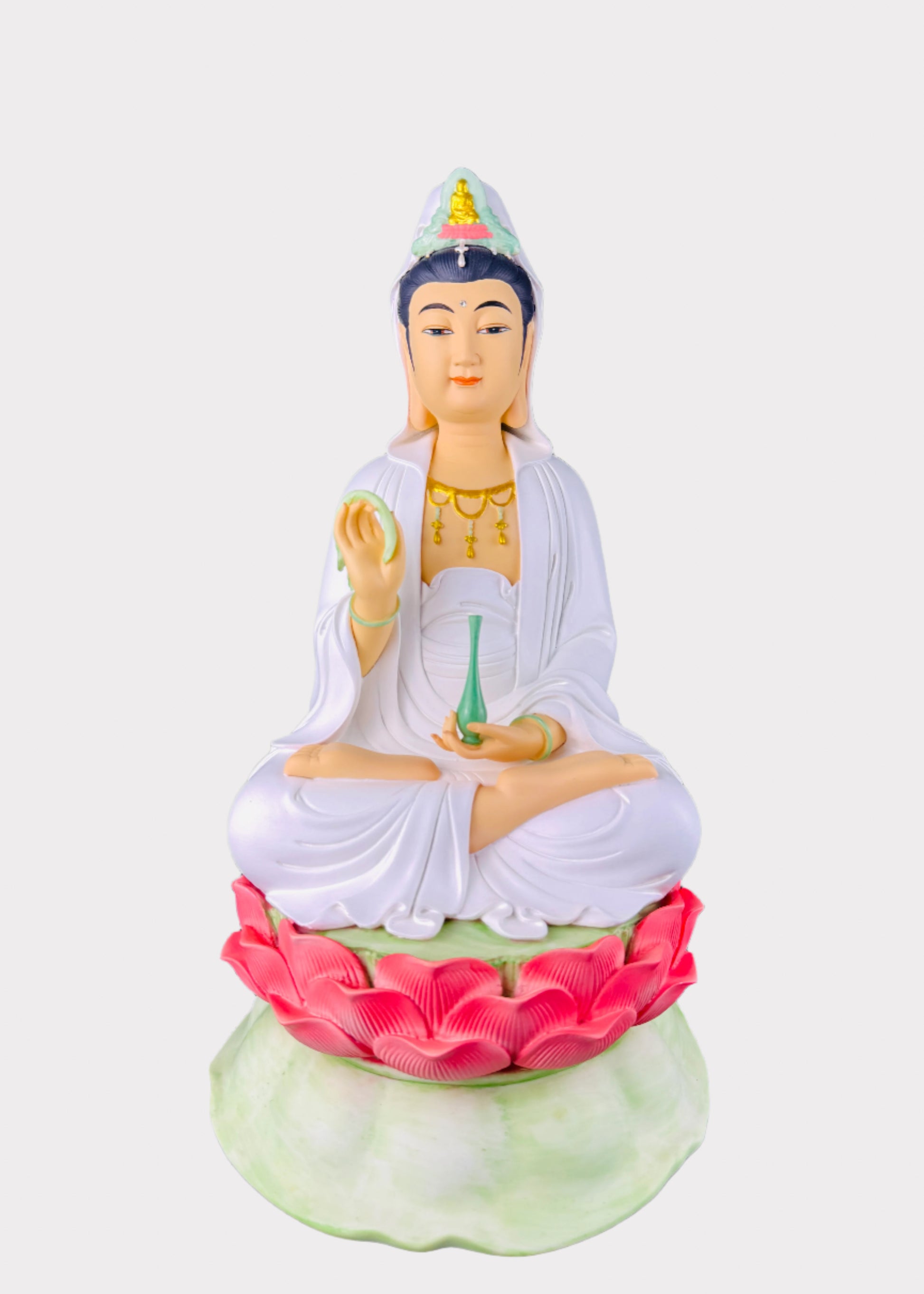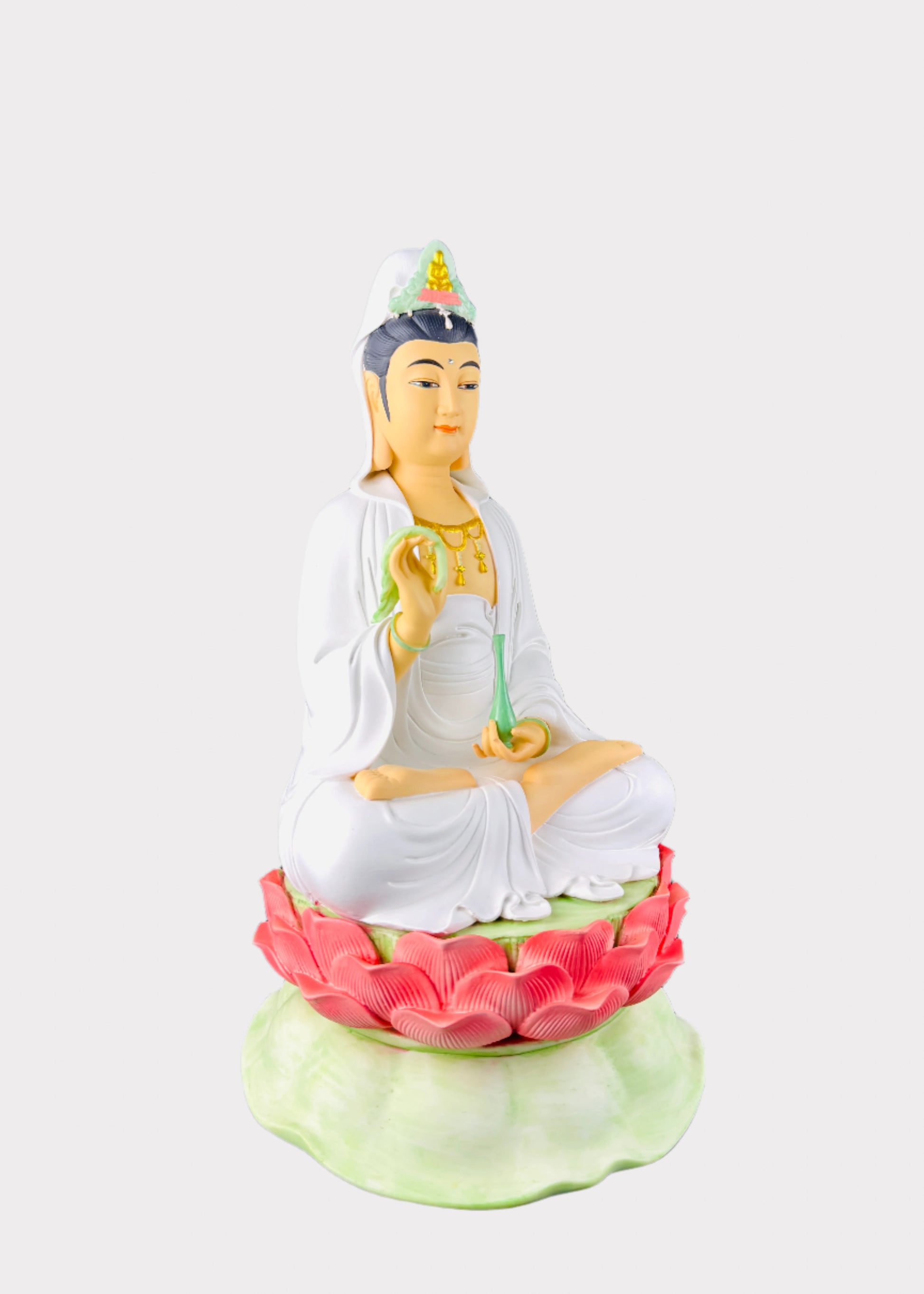 Draped in a flowing white robe, she is seated gracefully upon a vibrant pink and green lotus, symbolizing purity and enlightenment. In one hand, she holds a gold-accented vase, representing the sacred nectar of compassion, while in the other, she delicately carries a bamboo stalk, signifying resilience and inner strength. Subtle gold accessories add a touch of elegance, highlighting the statue’s divine presence.