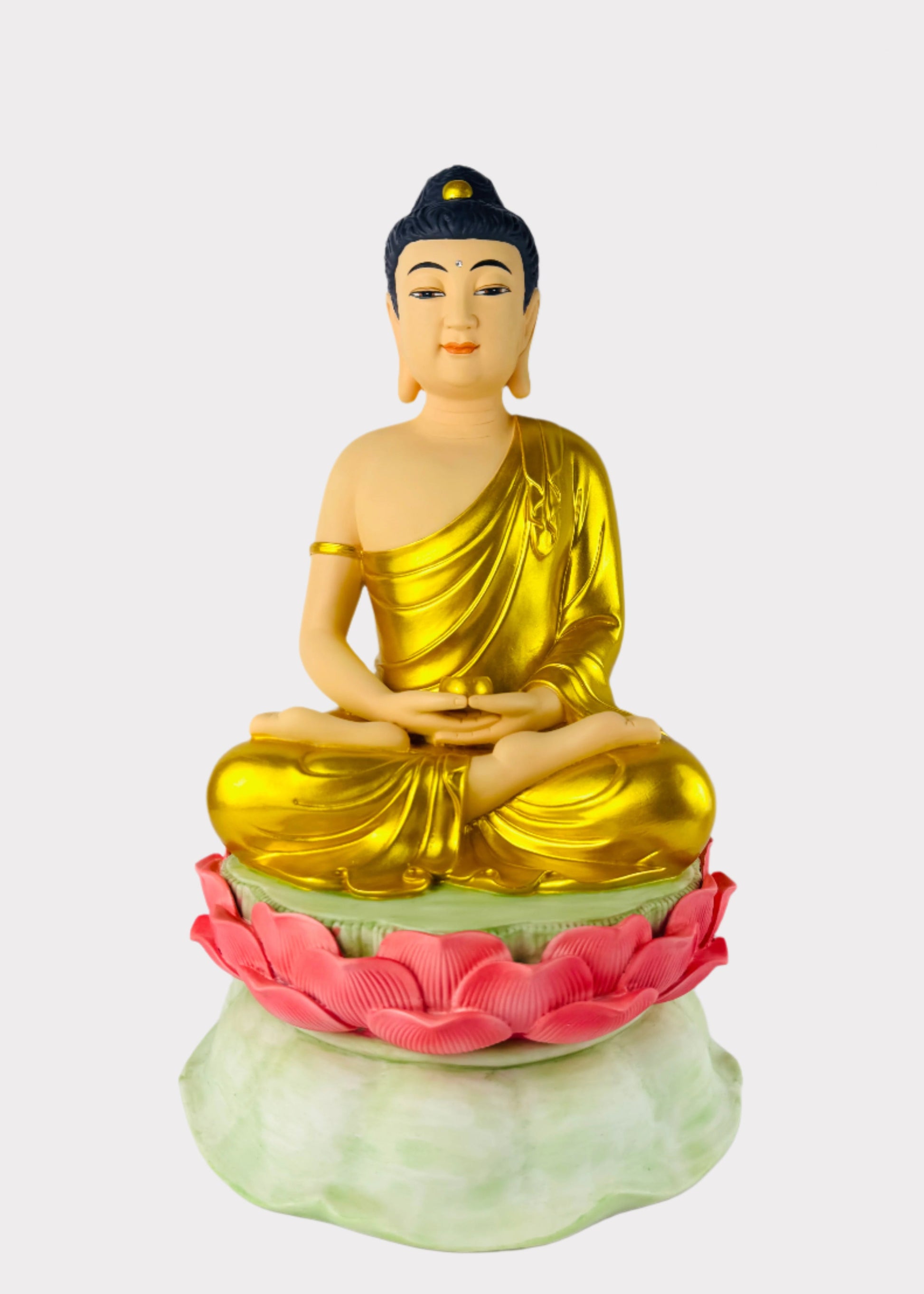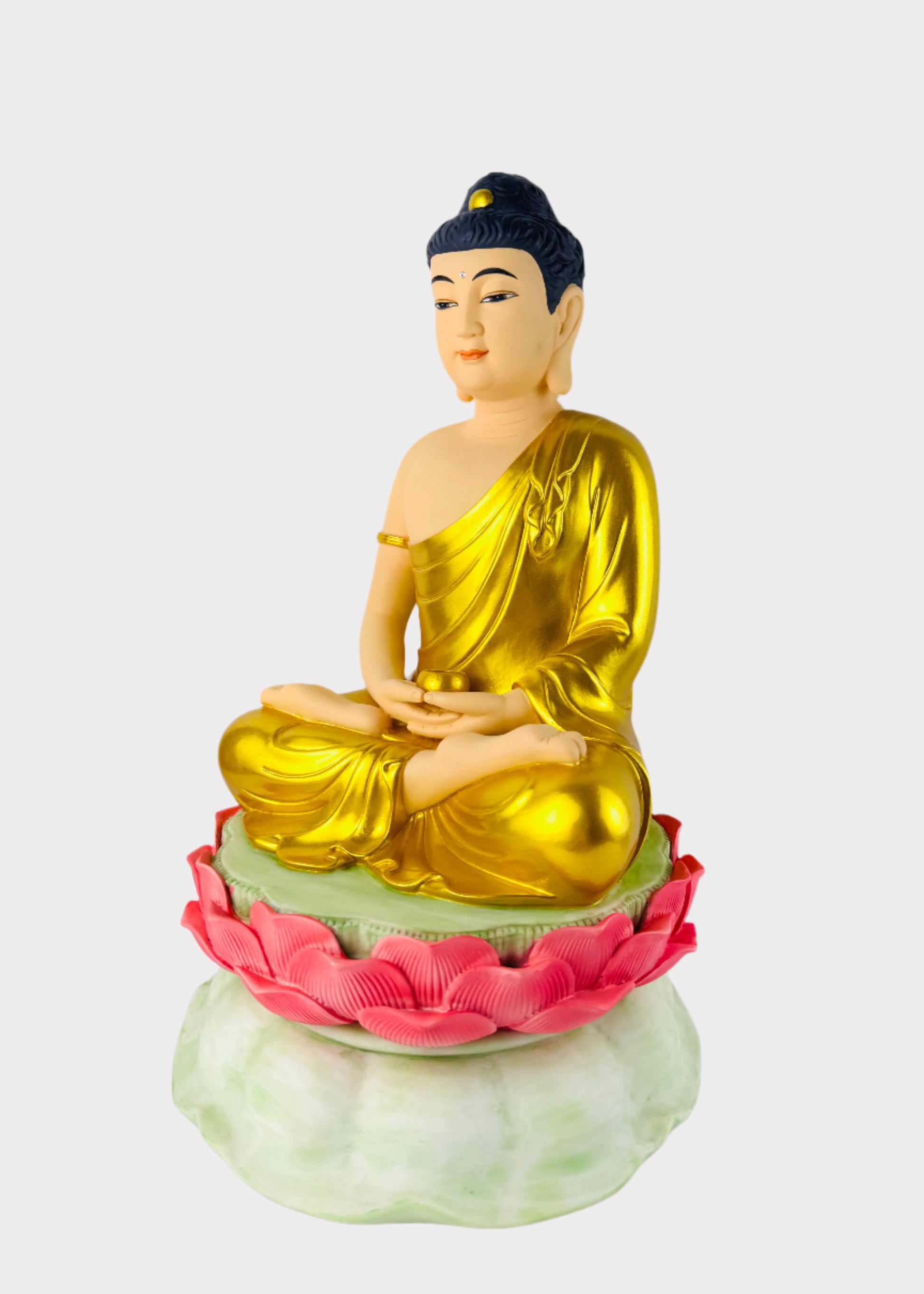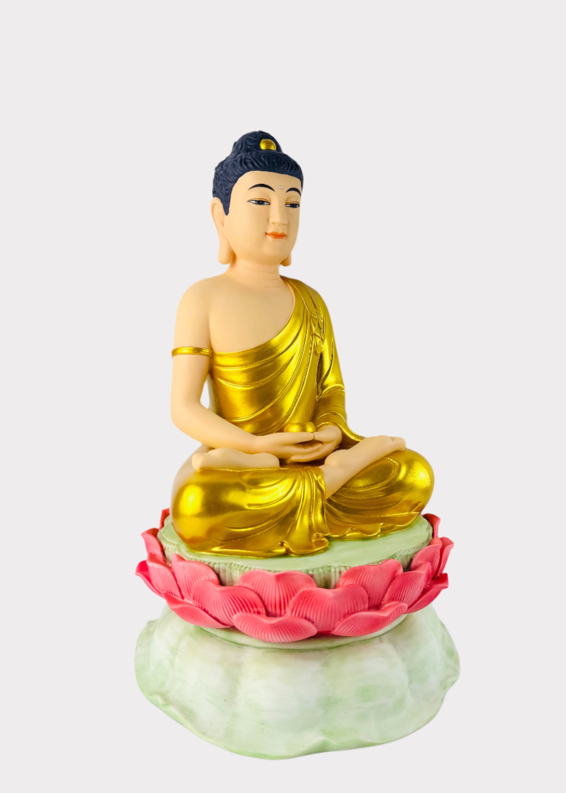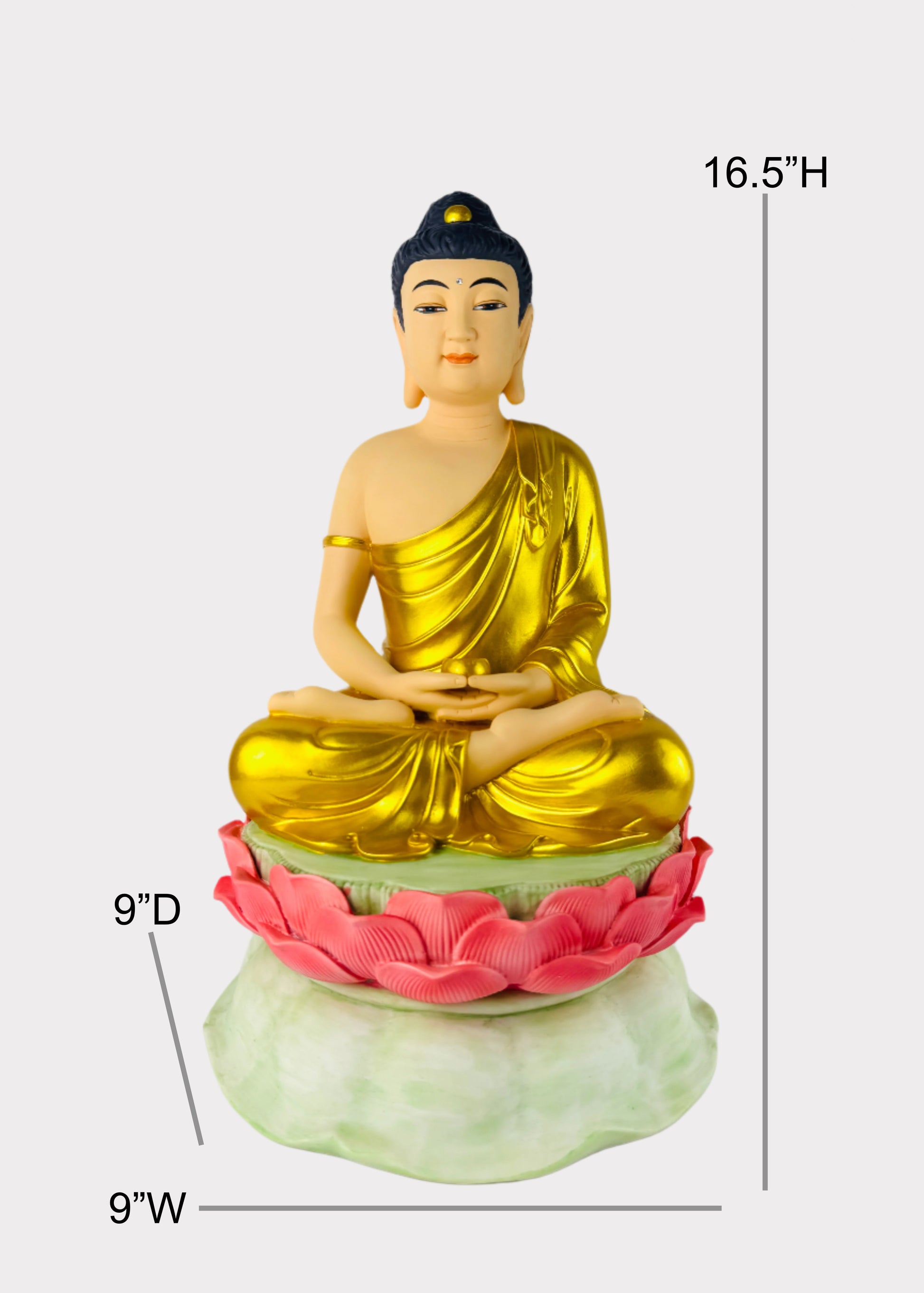 Draped in a radiant golden robe, Shakyamuni Buddha sits gracefully upon a pink and green lotus, symbolizing purity and awakening. His serene and compassionate expression emanates tranquility, while he holds a golden bowl in his hands, representing abundance, spiritual nourishment, and the act of giving and receiving. Subtle gold detailingenhances his divine presence, making this statue an elegant and meaningful addition to any altar, meditation space, or sacred setting.