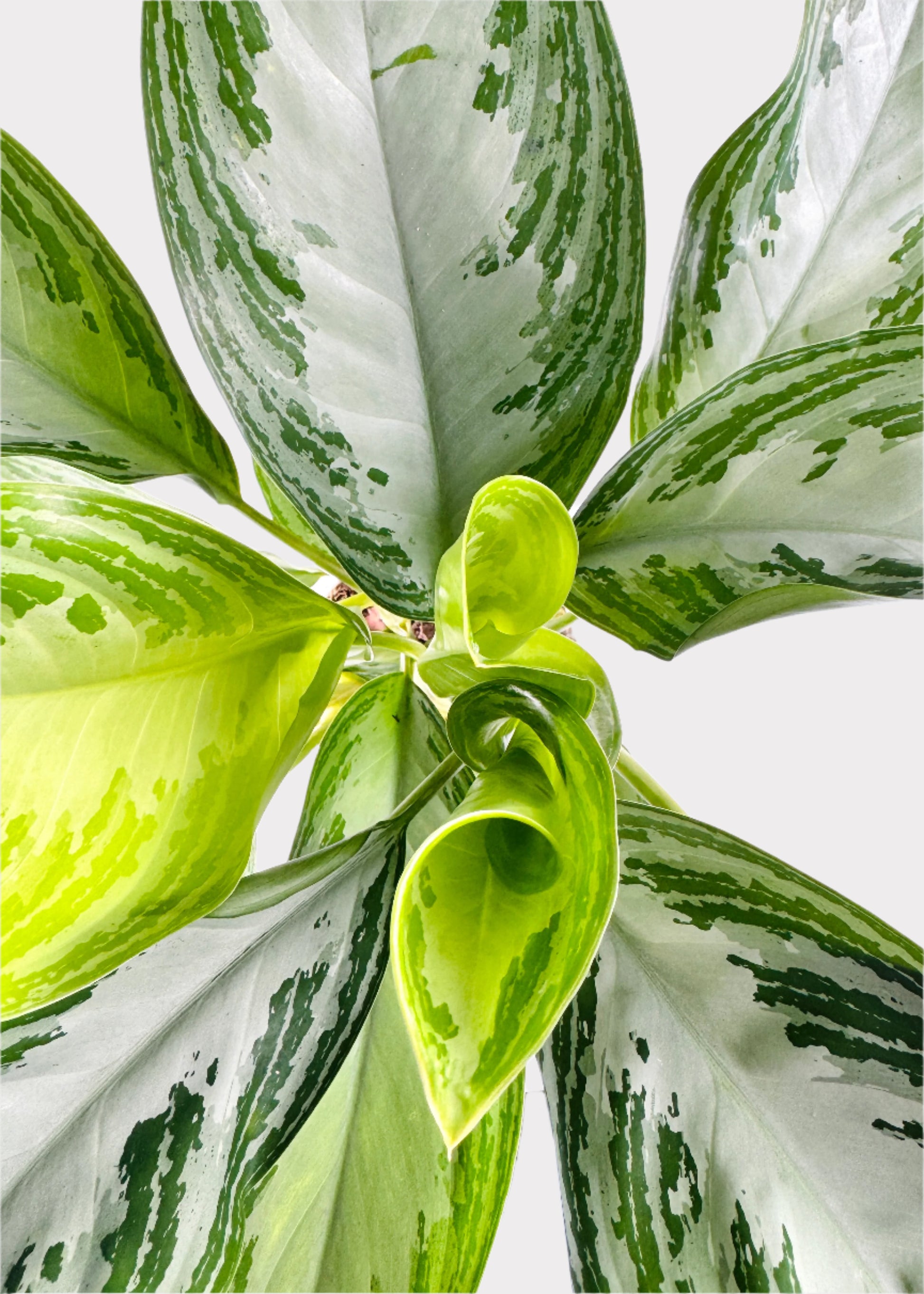 A lush, low-maintenance Chinese Evergreen with soft silver centers and rich green margins. Known for its forgiving nature and air-purifying abilities, it’s a calming, dependable choice for homes, offices, or shaded corners.