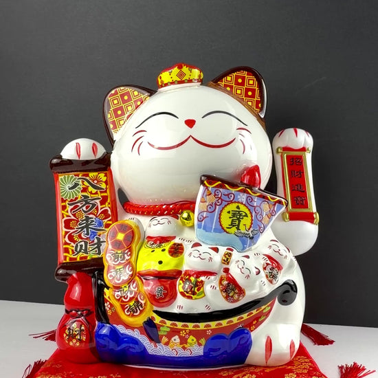 This ceramic lucky money cat is a traditional symbol of prosperity, wealth, and good fortune, beautifully crafted with colorful details and auspicious elements. Designed to bring positive energy and abundance, it makes a meaningful decorative accent for homes, offices, and businesses.