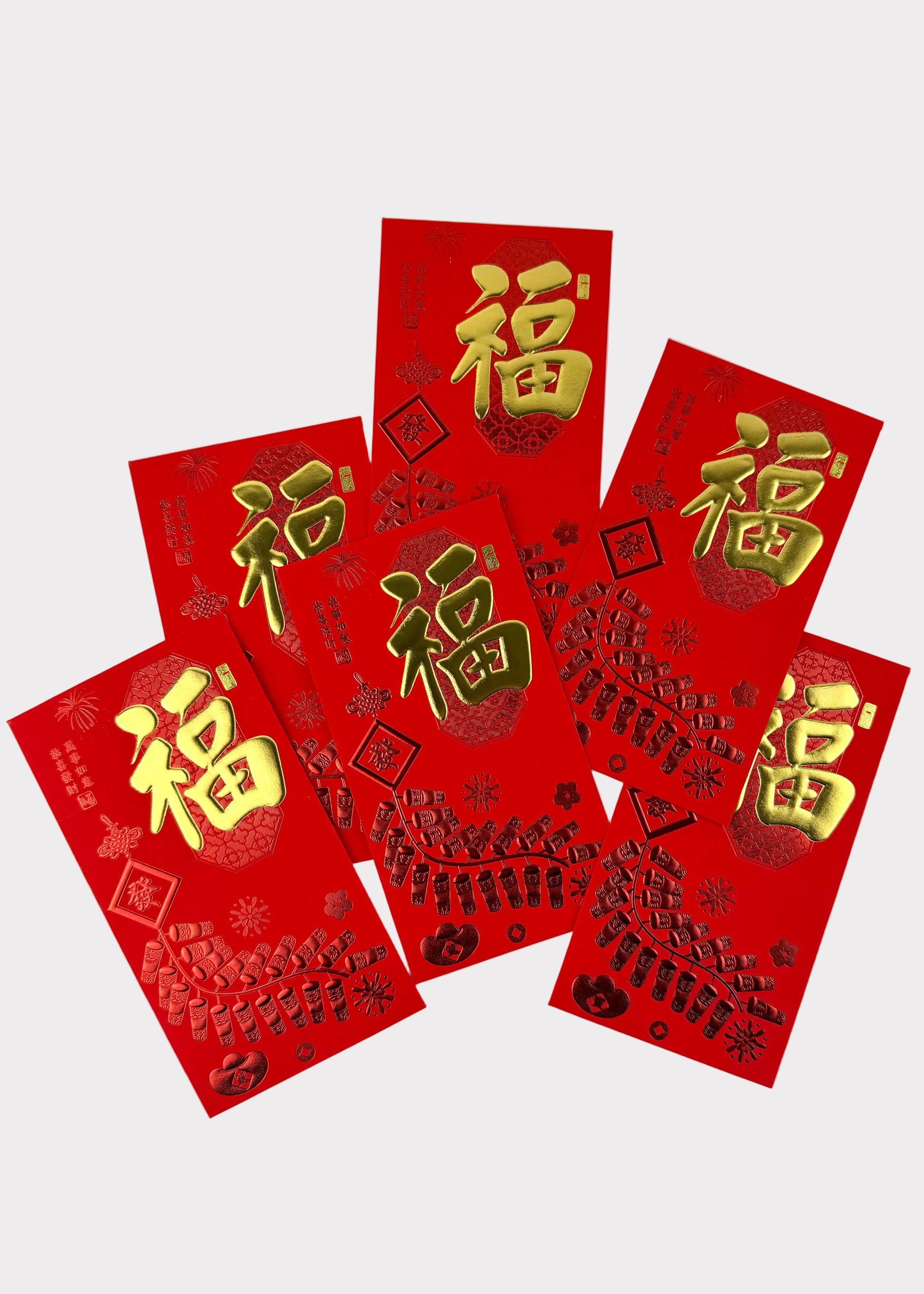 These classic fortune red envelopes feature timeless Lunar New Year symbolism with a refined, traditional look. Each envelope showcases a large fortune symbol in raised, embossed gold foil, set against a vibrant red background with richly detailed textures.