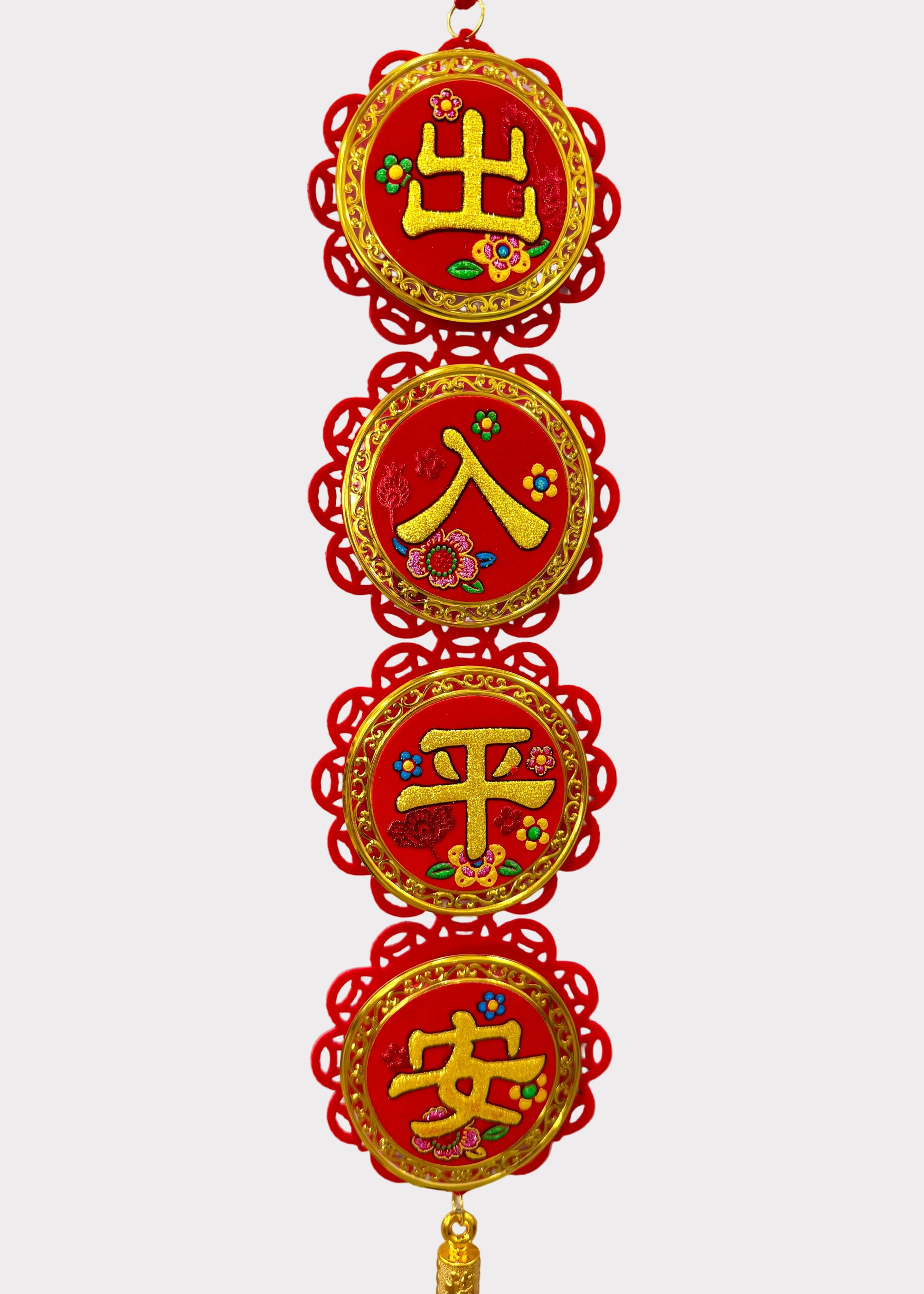 This festive Lunar New Year hanging decor features a vertical arrangement of round medallions crafted from felt, accented with gold-tone details and paired with auspicious sayings traditionally associated with luck, prosperity, and positive blessings.