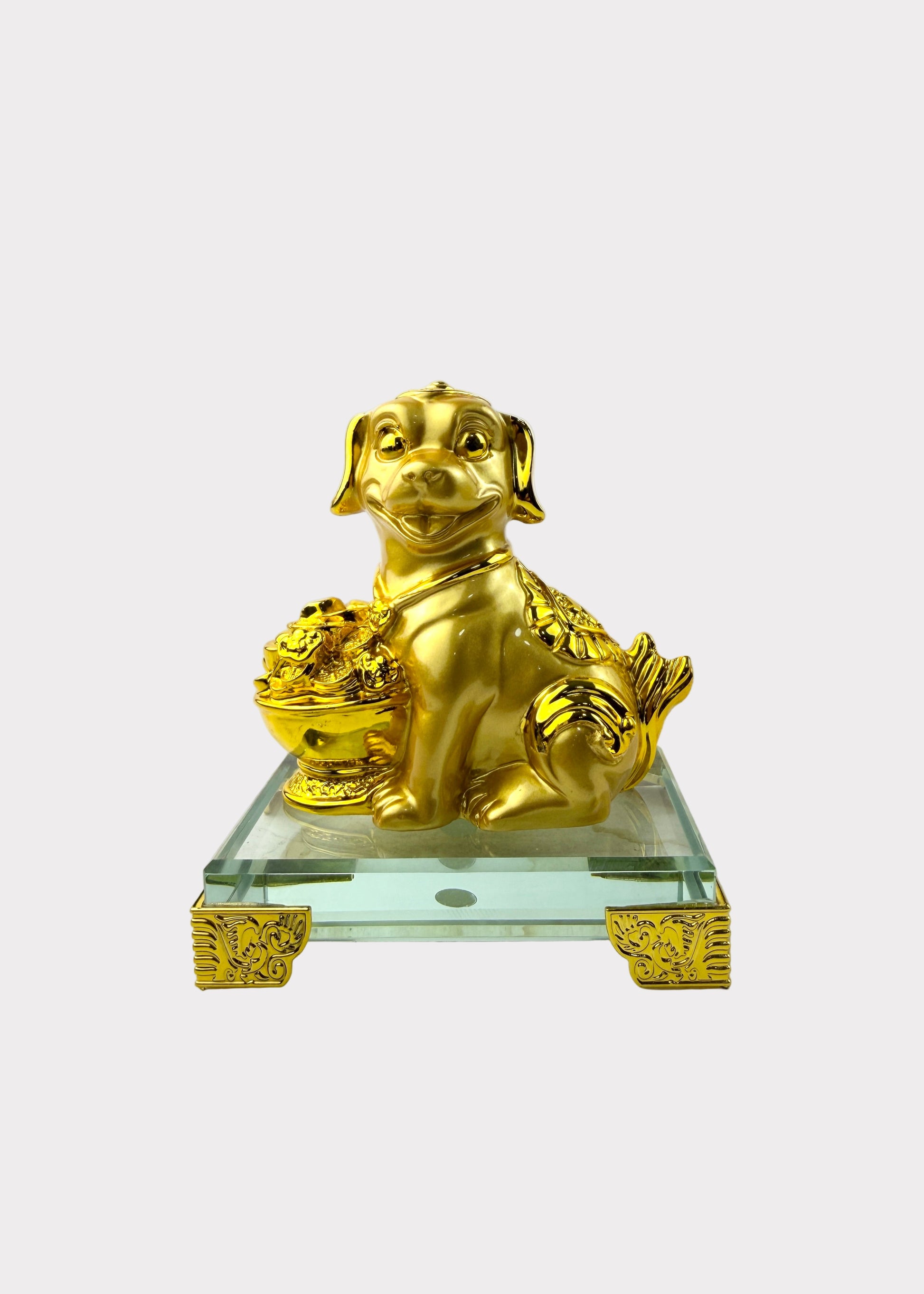 The Dog is a cherished symbol of loyalty, honesty, and protection in Chinese culture. This elegant golden Dog zodiac figurine captures its faithful spirit in fine detail, seated proudly on a clear glass base with ornate golden feet for a refined finish.