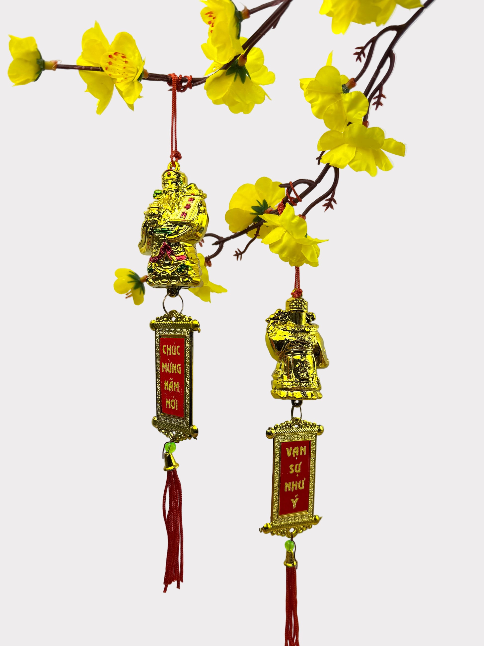 Welcome abundance and good fortune into your home with this Golden God of Wealth Hanging Ornament, a symbol of prosperity and success during Lunar New Year. Crafted in gleaming gold with red and green accents, the ornament features the God of Wealth holding a scroll and is paired with festive red banners that read “Chúc Mừng Năm Mới” (Happy New Year) and “Vạn Sự Như Ý” (May all things go your way).