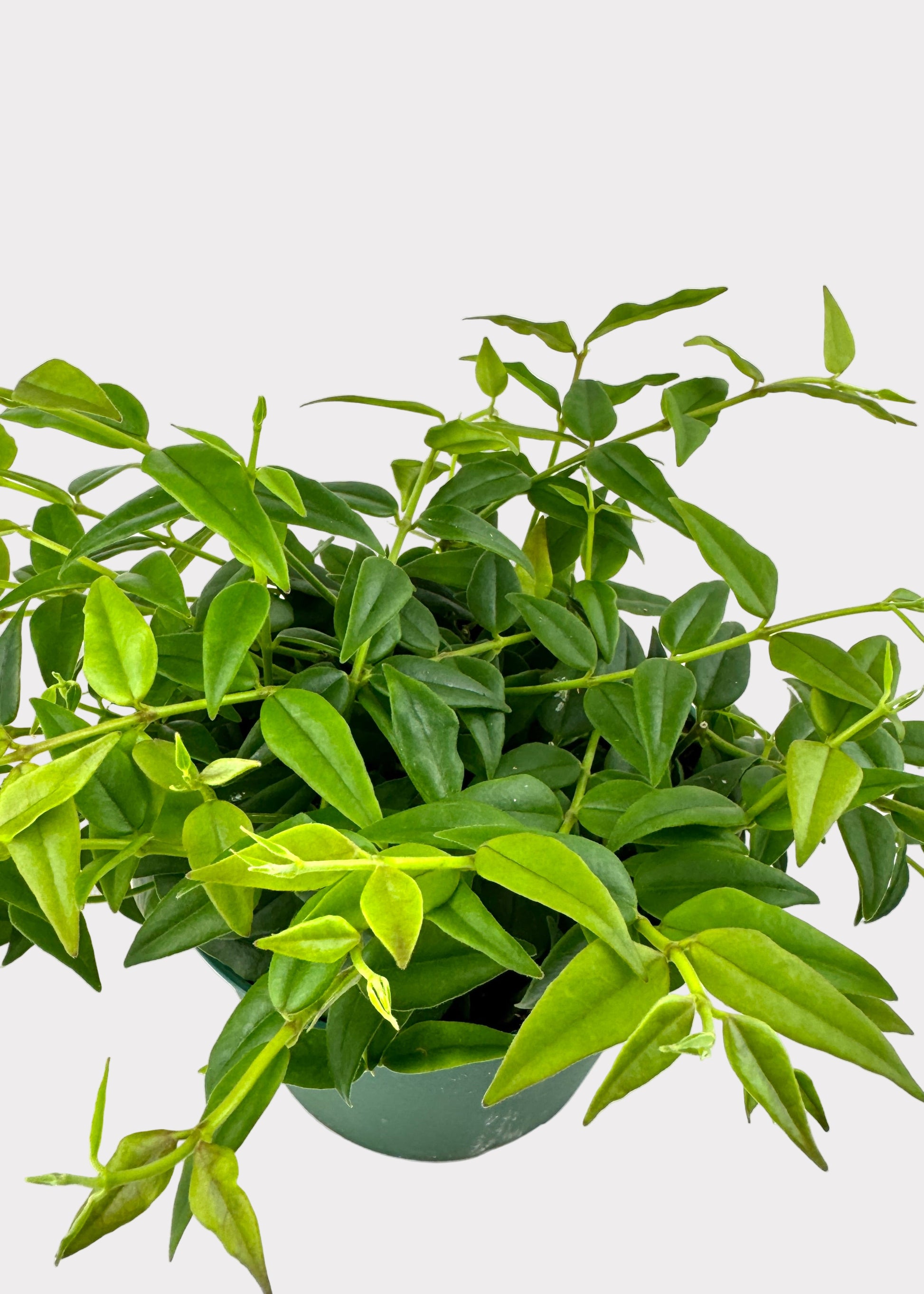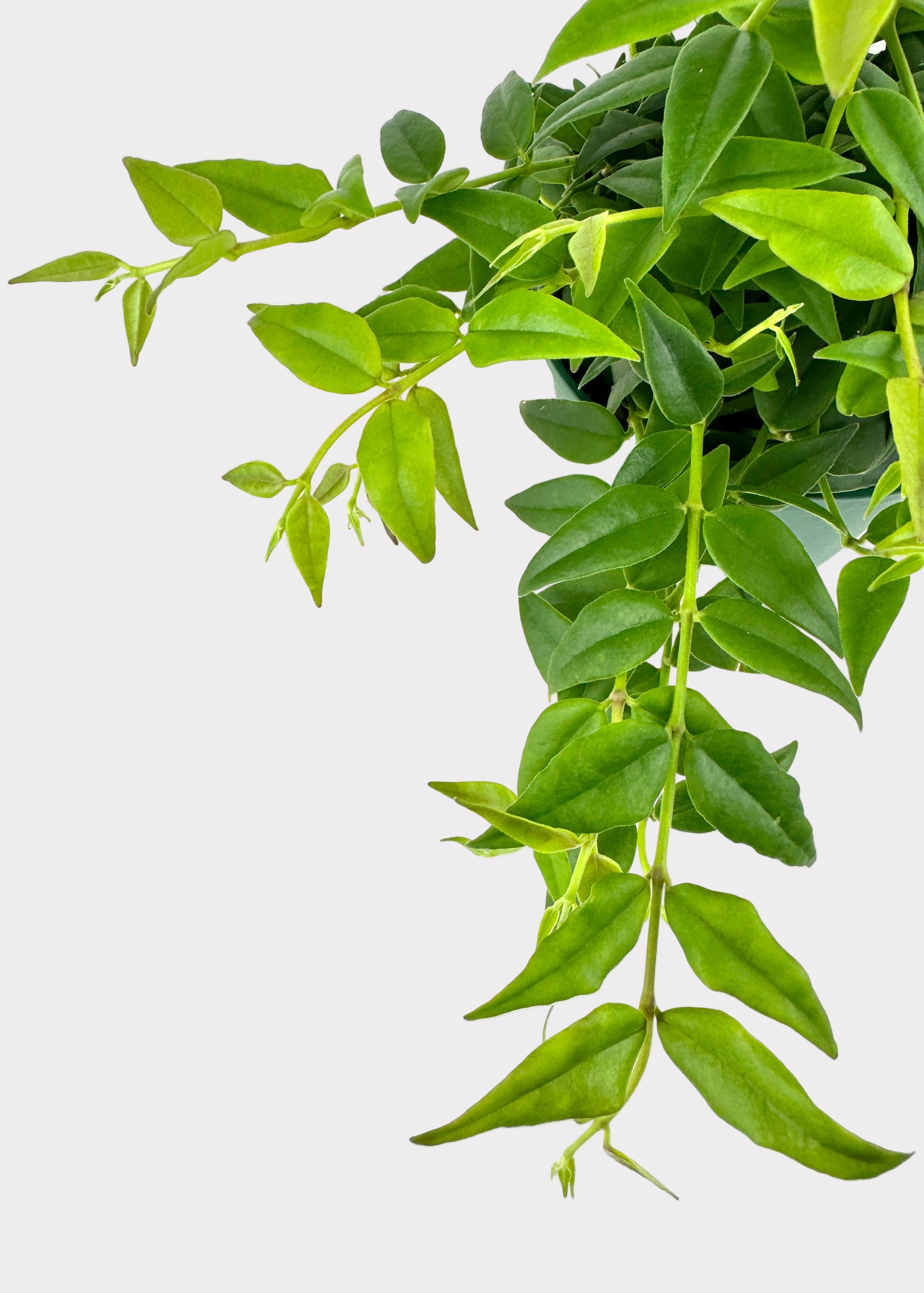 Hoya Bella is a charming, compact variety adored for its cascading vines and clusters of delicate white star-shaped flowers with pink centers. Its slender, glossy leaves and constant blooming nature make it one of the most elegant hoyas for hanging baskets or shelf displays. Known for being easy to care for, it adds a touch of grace and fragrance to any indoor plant collection.