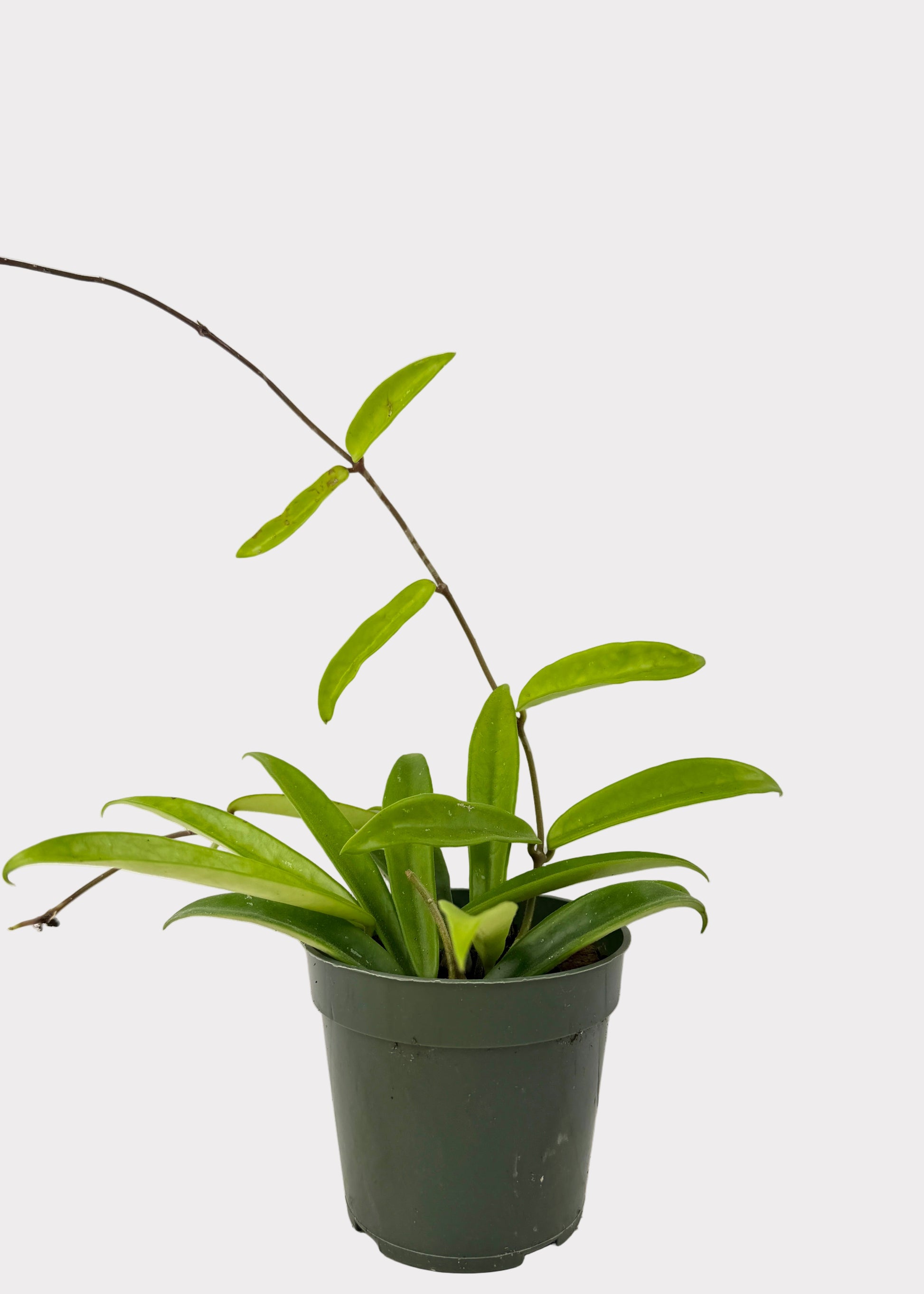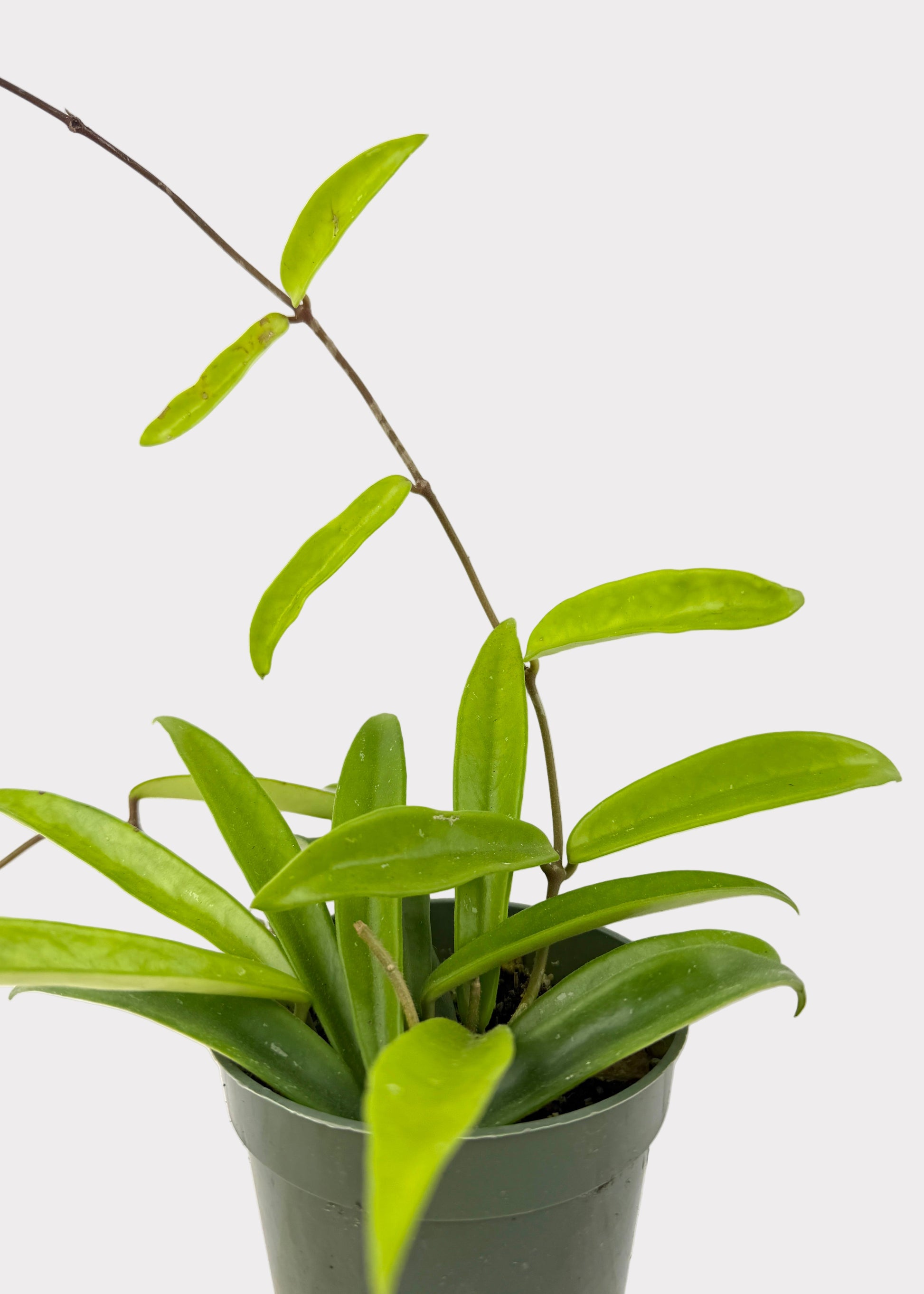 The Hoya Minibelle is a charming hybrid between Hoya shepherdii and Hoya carnosa, combining the best traits of both parents. It features long, narrow leaves with a glossy surface and slight waviness, giving it a graceful, cascading form. When mature, it produces clusters of pink, star-shaped flowers with a crimson center and a sweet fragrance that fills the air. Compact yet vigorous, this Hoya is perfect for trailing from hanging baskets or climbing along a trellis, rewarding bright light and consistent care with abundant blooms.