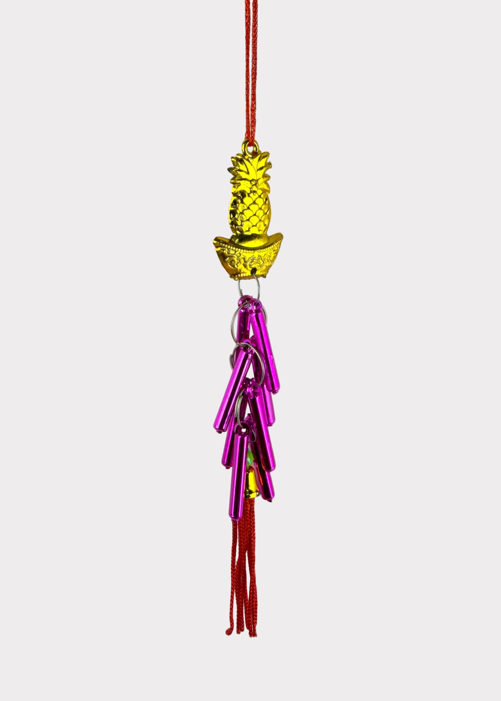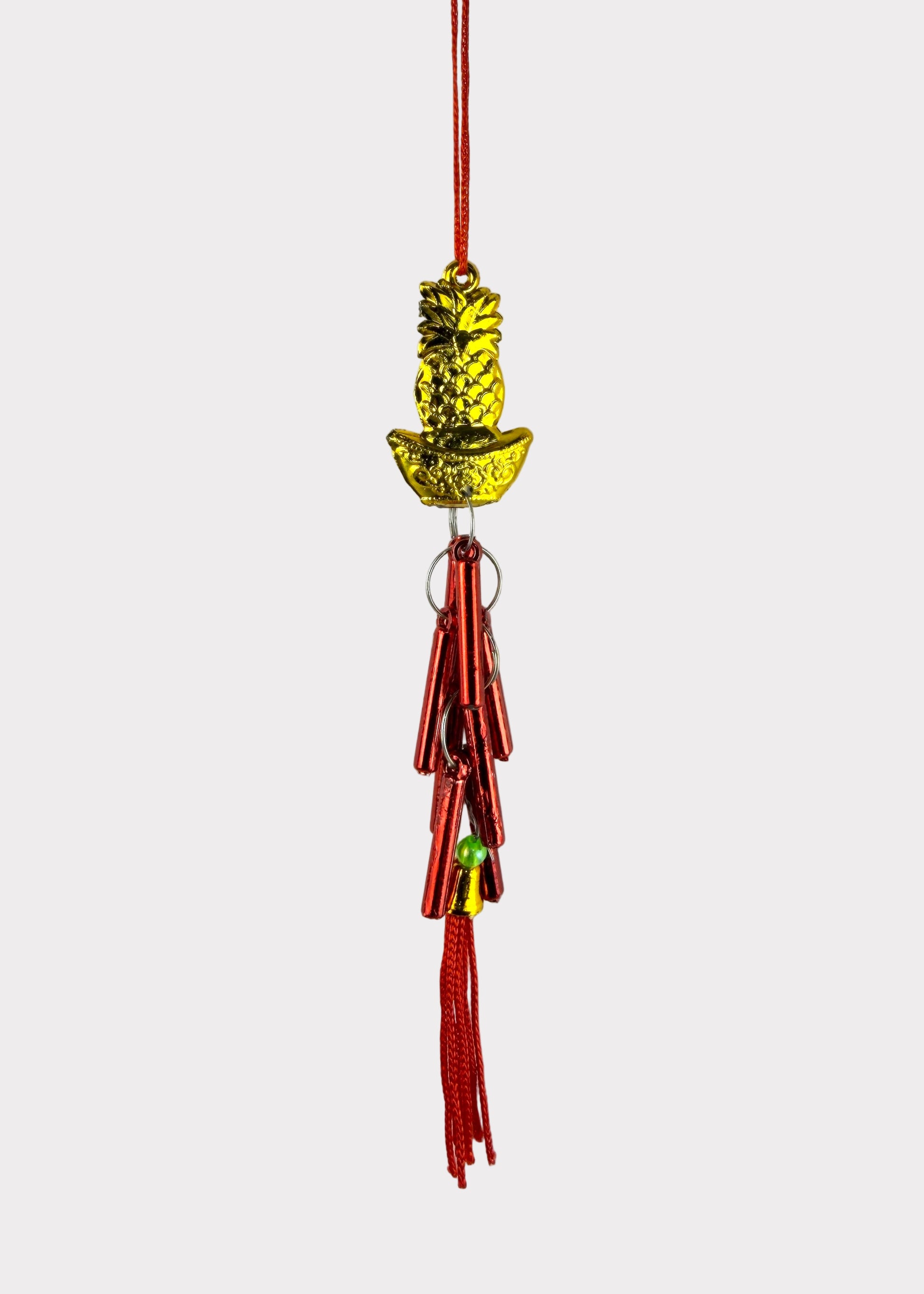 Celebrate the Lunar New Year with this 10-piece set of Pineapple with Firecrackers Hanging Ornaments. Each ornament features a golden pineapple atop a gold ingot, symbolizing wealth and good fortune, paired with metallic firecrackers in vibrant festive colors.