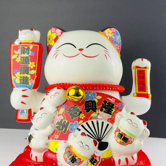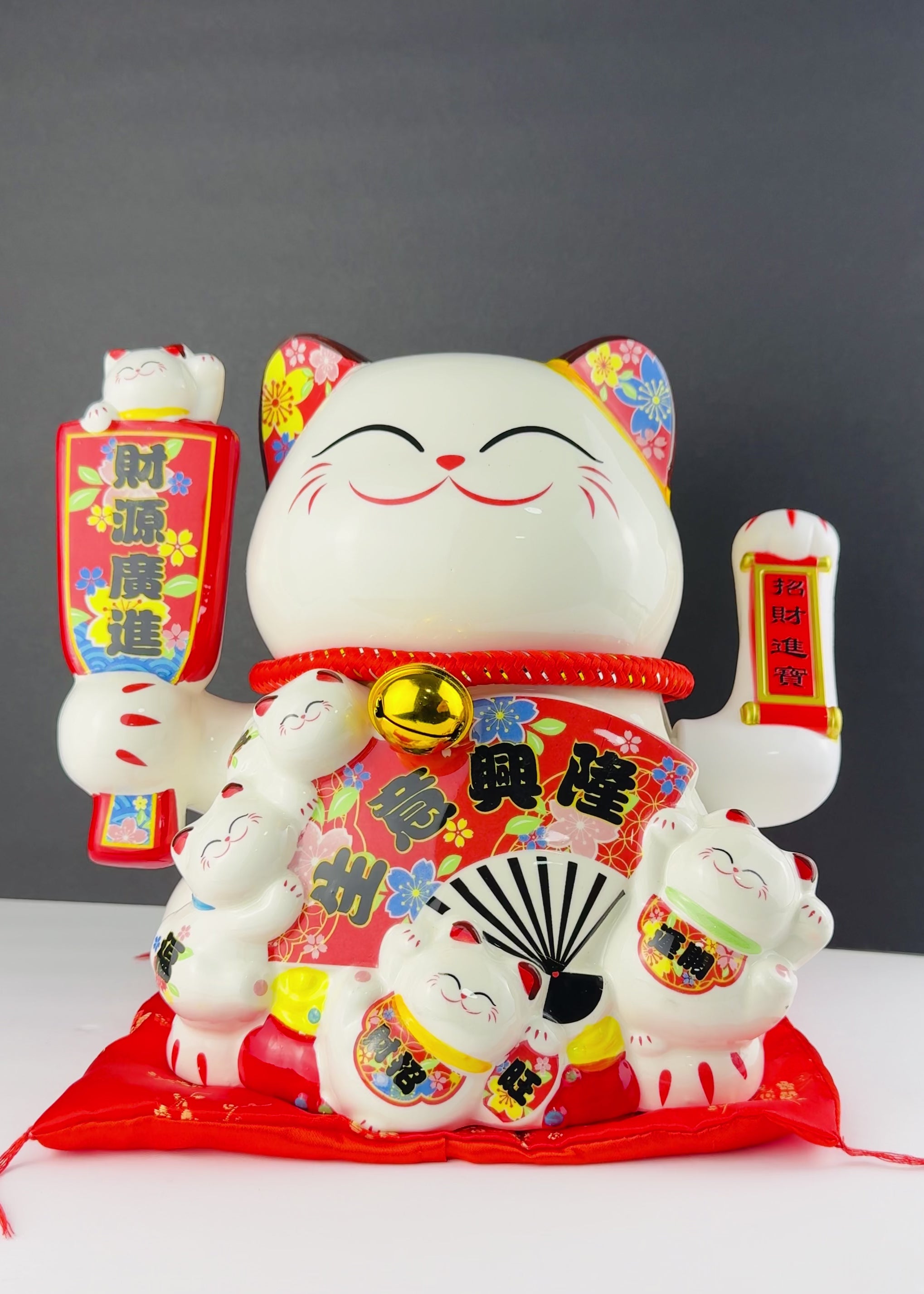 Welcome wealth, happiness, and prosperity into your space with this delightful Money Cat figurine! Seated atop a vibrant red pillow, this beautifully detailed ceramic cat features a joyful expression and a continuous waving arm, symbolizing the flow of good fortune and success. Designed for versatility, it can be powered by batteries or a DC plug—with the cable included for easy setup. Whether placed on an altar, office desk, storefront, or home, this lucky cat is the perfect blend of tradition and charm, making it an irresistible addition for attracting abundance and positive energy!