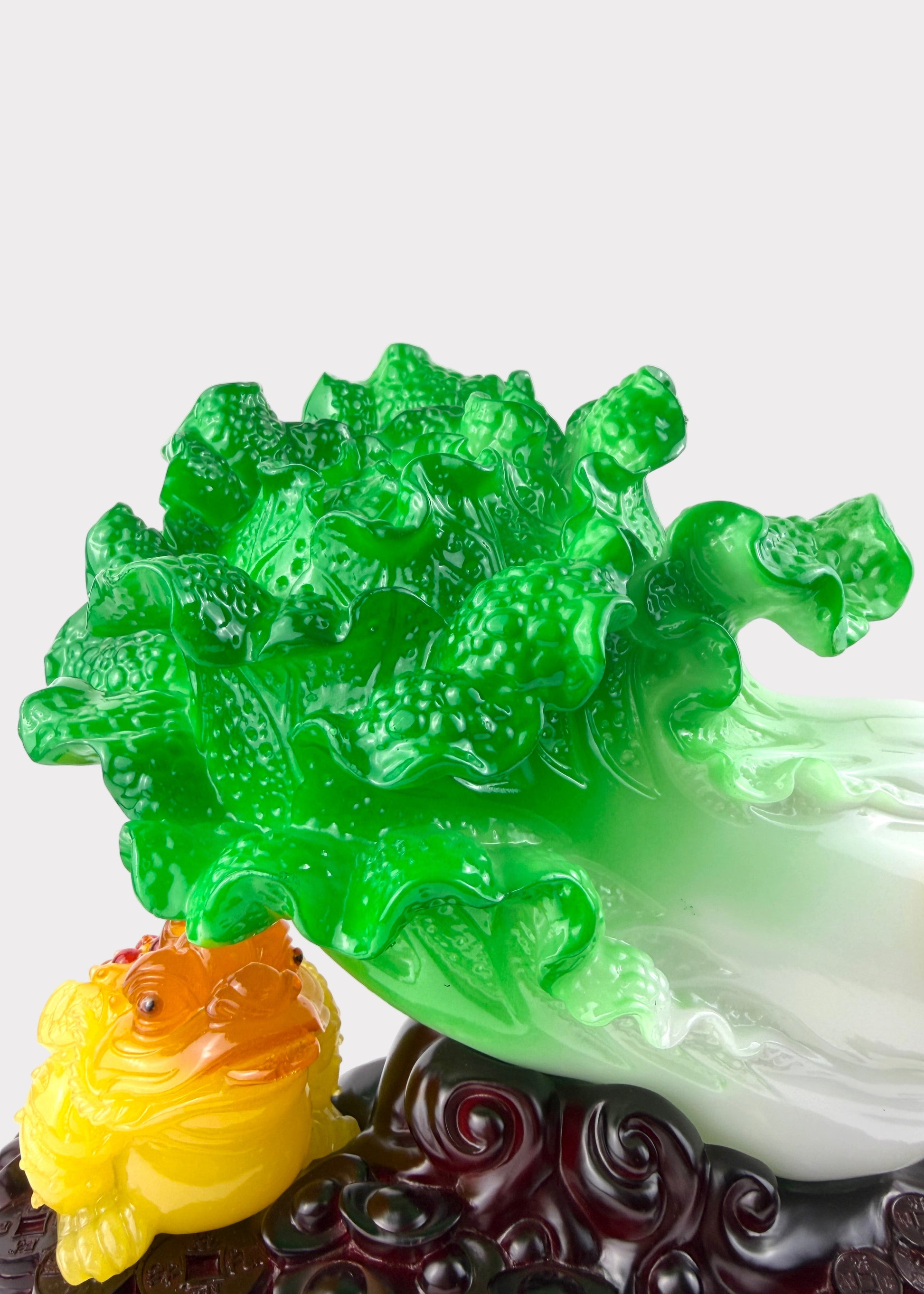 This Jadeite Cabbage with Golden Toad is a powerful feng shui symbol of wealth and success. Crafted from a jade-like material that captures the elegant gradient of real jadeite, the cabbage represents growth and abundance, while the golden toad signifies fortune and protection.