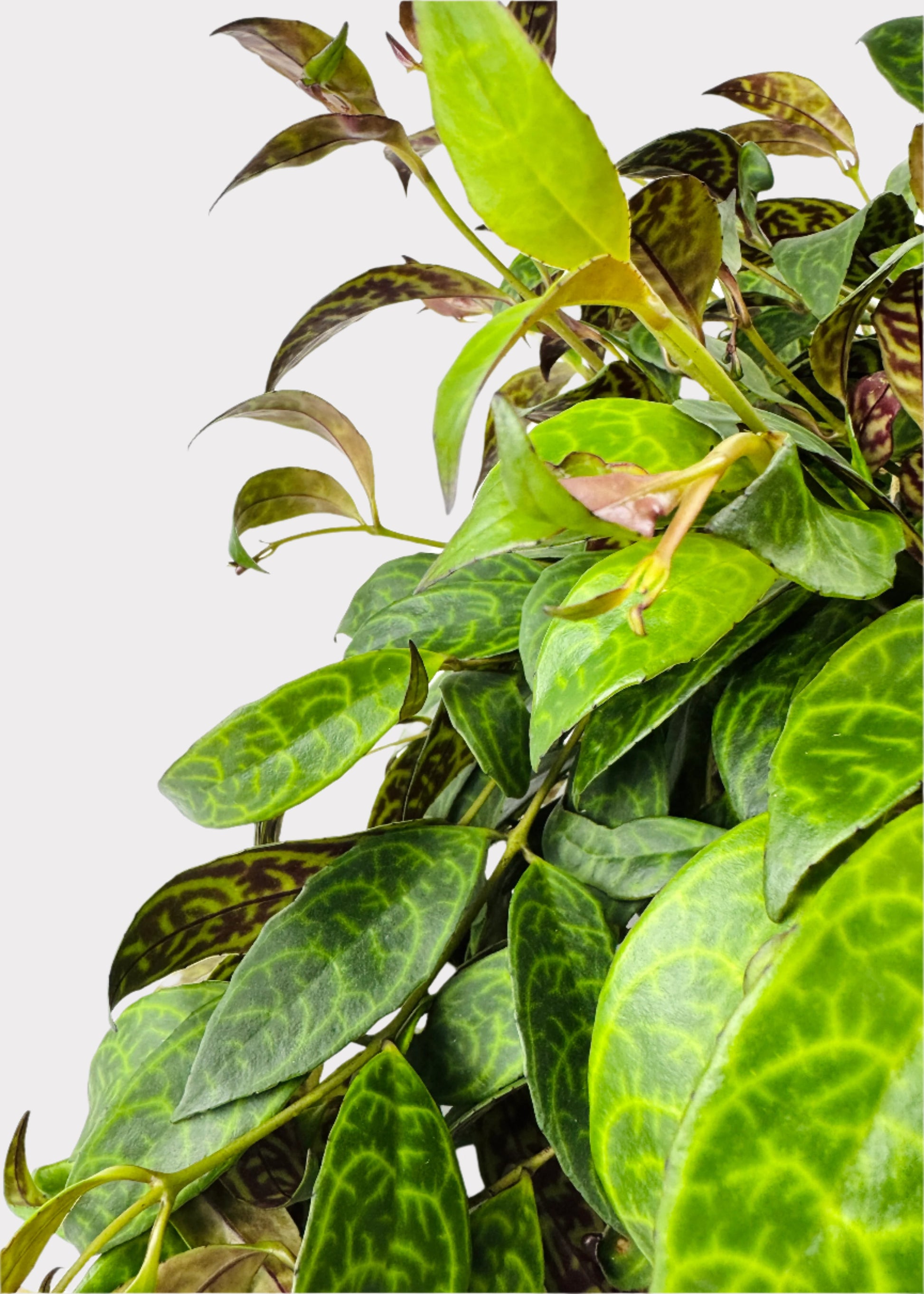 With trailing vines and mottled foliage in deep green, silver, and purple, the Black Pagoda variety adds dramatic flair to any shelf or hanging basket. When in bloom, its vibrant tubular flowers pop out like a tube of lipstick—adding a tropical, playful vibe to your space. This variety is both striking and pet-safe, making it a popular choice for houseplant lovers with furry companions.