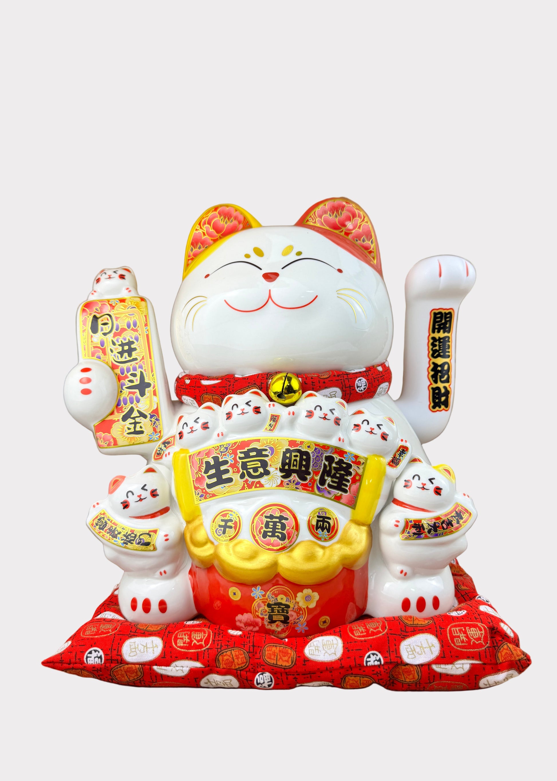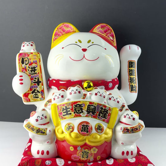 Bring abundance and prosperity to your home or business with this porcelain Lucky Money Cat featuring a wealth bucket centerpiece. Symbolizing overflowing fortune and successful ventures, this vibrant figurine is surrounded by smaller cats holding auspicious symbols and scrolls. The glossy porcelain finish highlights its cheerful face, raised paw, and intricate gold details, while the bright red cushion completes the display with elegance. Designed for convenience, this prosperity cat can be powered by two AA batteries or a DC adapter (USB charging block not included). Perfect as an altar centerpiece, shop display, or meaningful gift, the Lucky Cat with Wealth Bucket invites wealth, good luck, and positive energy into any space. A timeless Feng Shui charm, it’s both a decorative treasure and a powerful symbol of success.