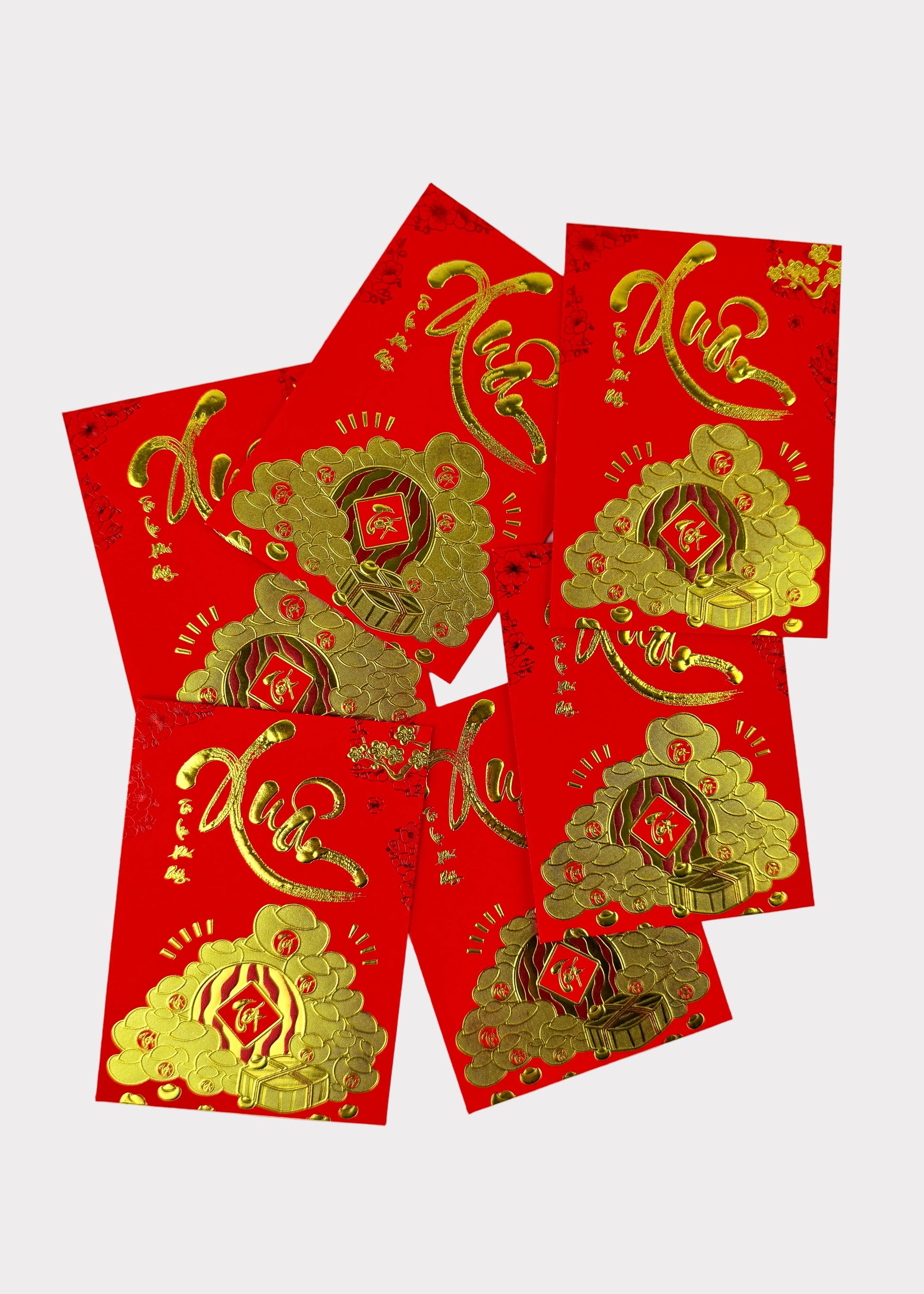 Each pack contains 6 red envelopes of the same design. The specific design will be selected at random at the time of packing. While the design may vary, all envelopes share the same premium quality, bold red color, and raised gold foil detailing.