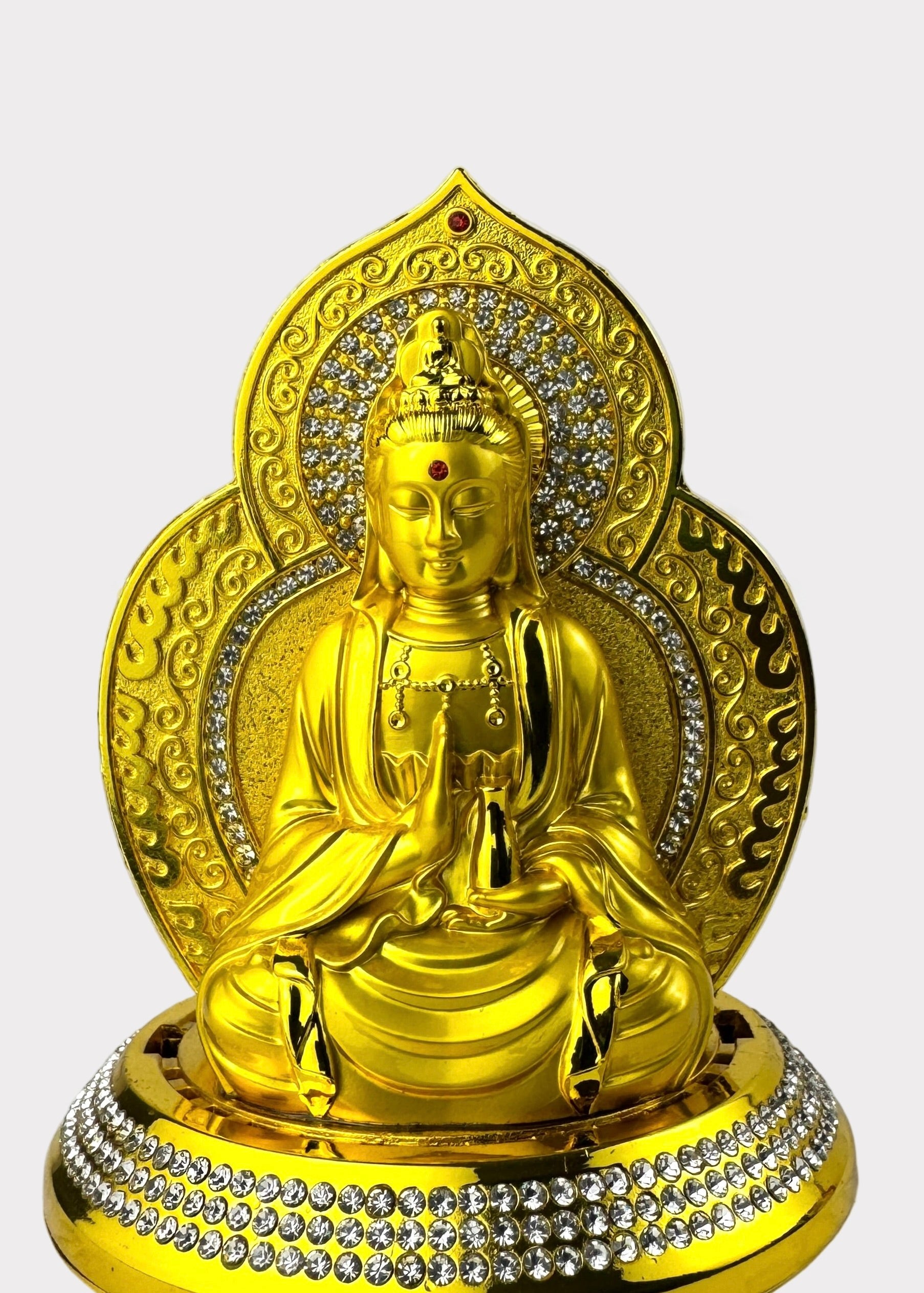 Honor the Bodhisattva of Compassion while gently scenting your space with this Guan Yin essential oil diffuser in a radiant gold tone. The seated figure rests before a layered mandorla with sparkling crystal accents, creating a devotional focal point for altars, desks, and entry tables. An integrated reservoir in the base holds a few drops of your favorite essential oil for soft, non electric diffusion that refreshes small rooms or a car without overpowering. Crafted from a durable metal alloy with a gold tone finish, the piece highlights serene facial details, prayerful hand mudras, and a lotus inspired base for a refined shrine look. To use, add 2 to 4 drops of oil to the well, place on a stable surface, and refresh as needed. Wipe clean with a soft cloth. Keep oils away from pets and children and avoid contact with painted or delicate finishes. A meaningful gift that brings calm and brightness.