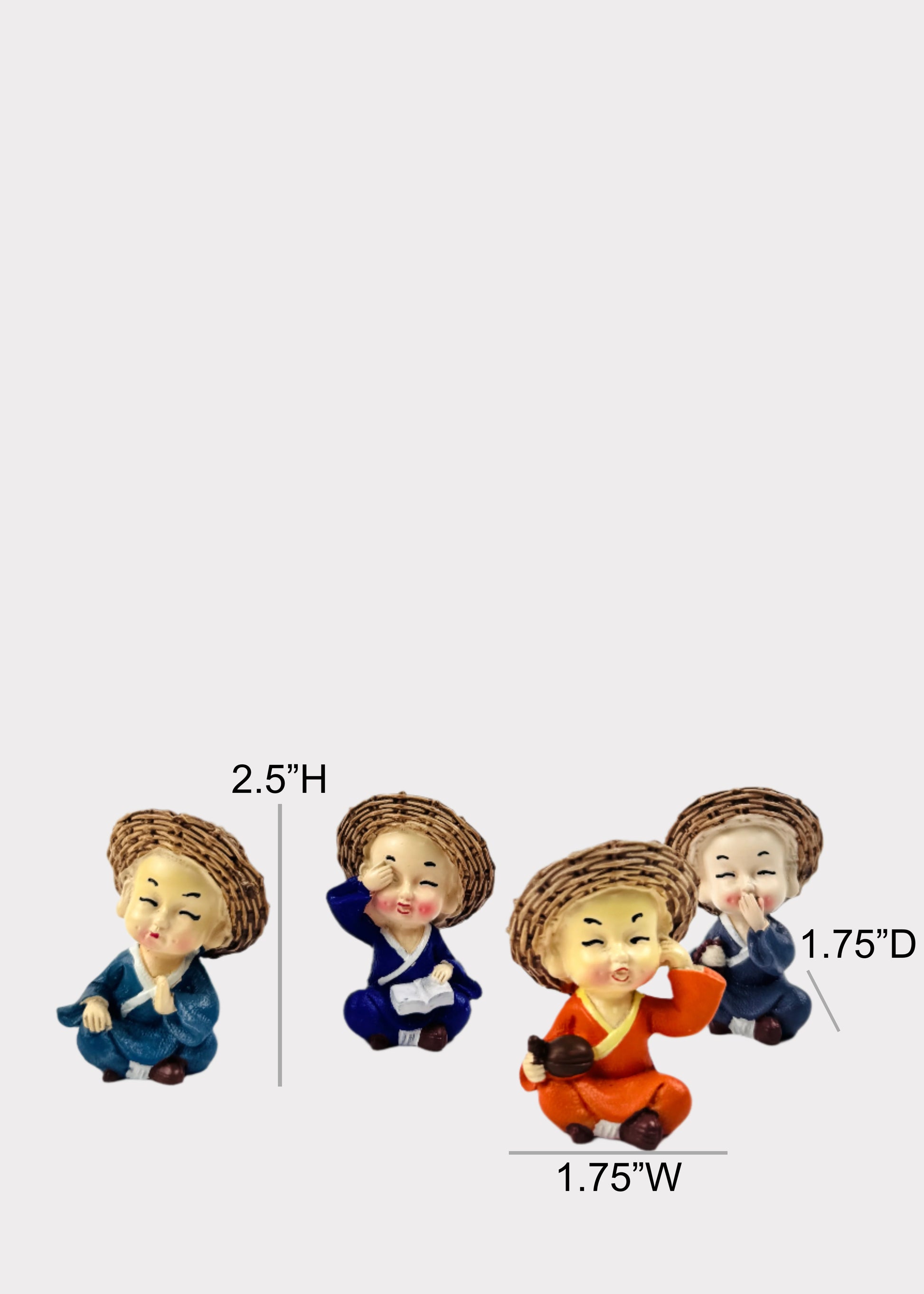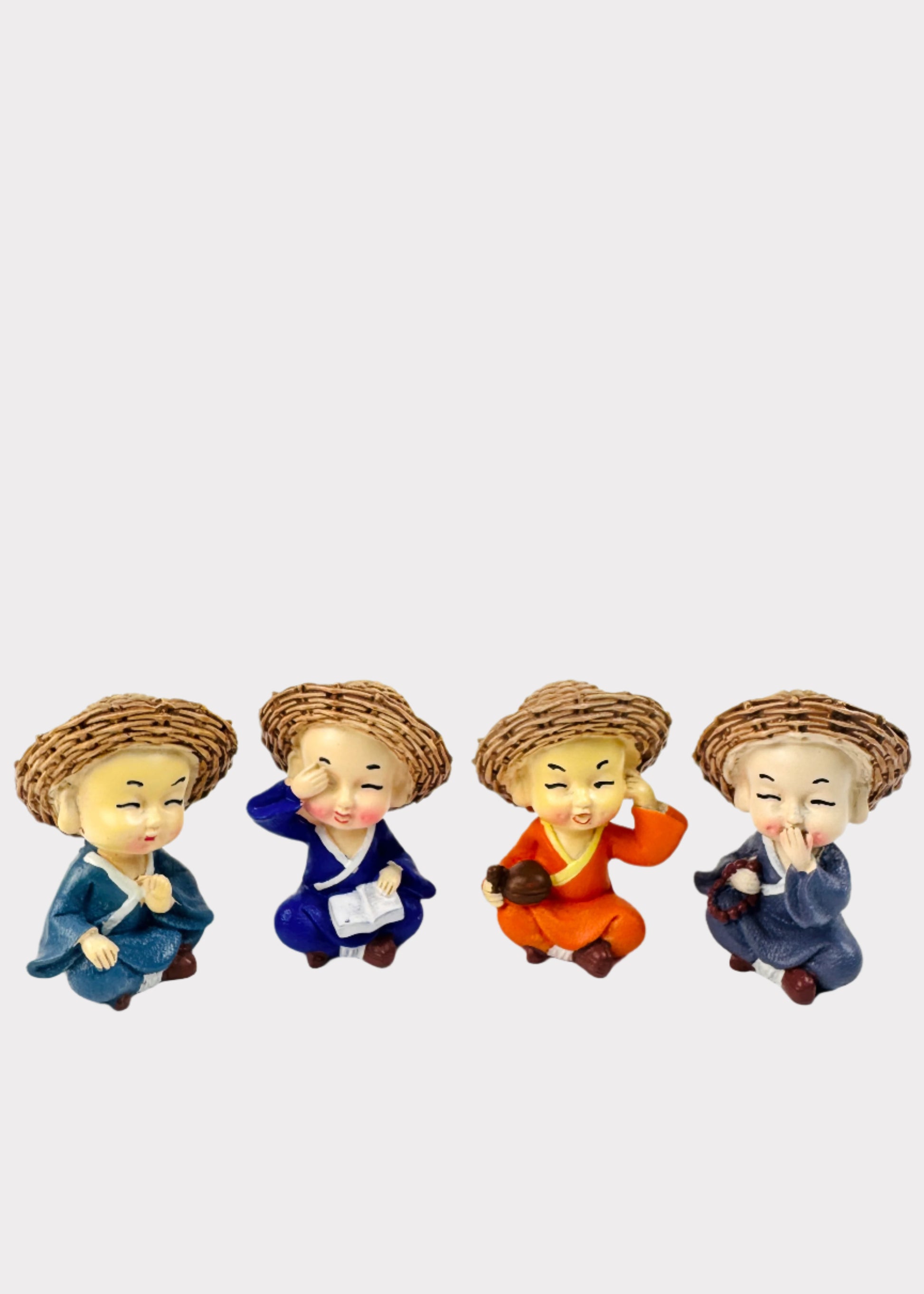 Add a touch of serenity and charm to your space with this delightful set of four monk figurines, each wearing a traditional straw hat and expressing pure joy. Their cheerful faces radiate positivity, making them perfect desk companions or peaceful accents for your bonsai garden, home altar, or shelf.