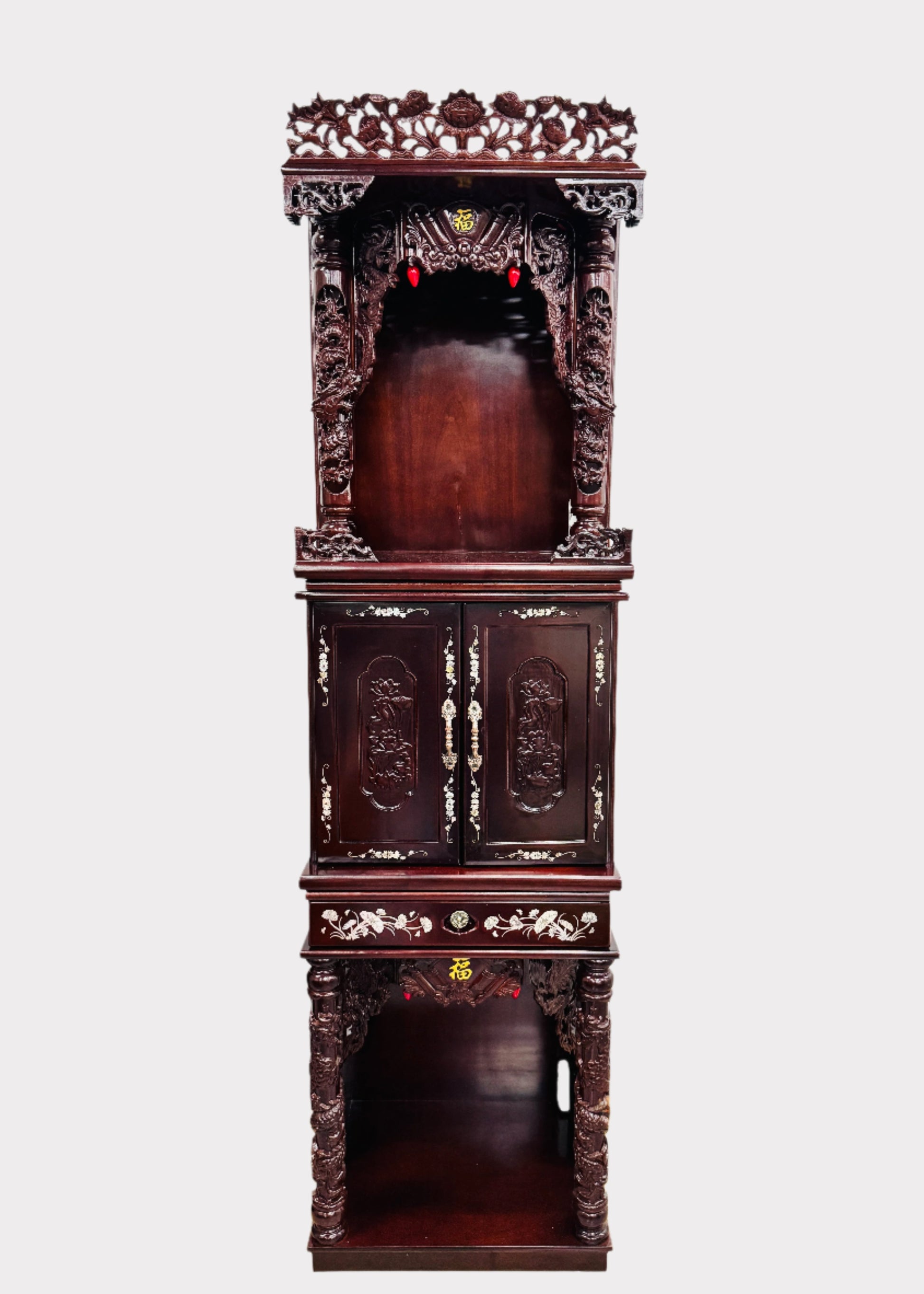 This altar features a three-tier structure, offering ample space for arranging deities, offerings, and ritual items. The middle tier houses a spacious cabinet with soft-closing double doors, providing a discreet and elegant storage solution for altar supplies, incense, and sacred essentials. The upper and lower tiers allow for a harmonious display of spiritual elements.