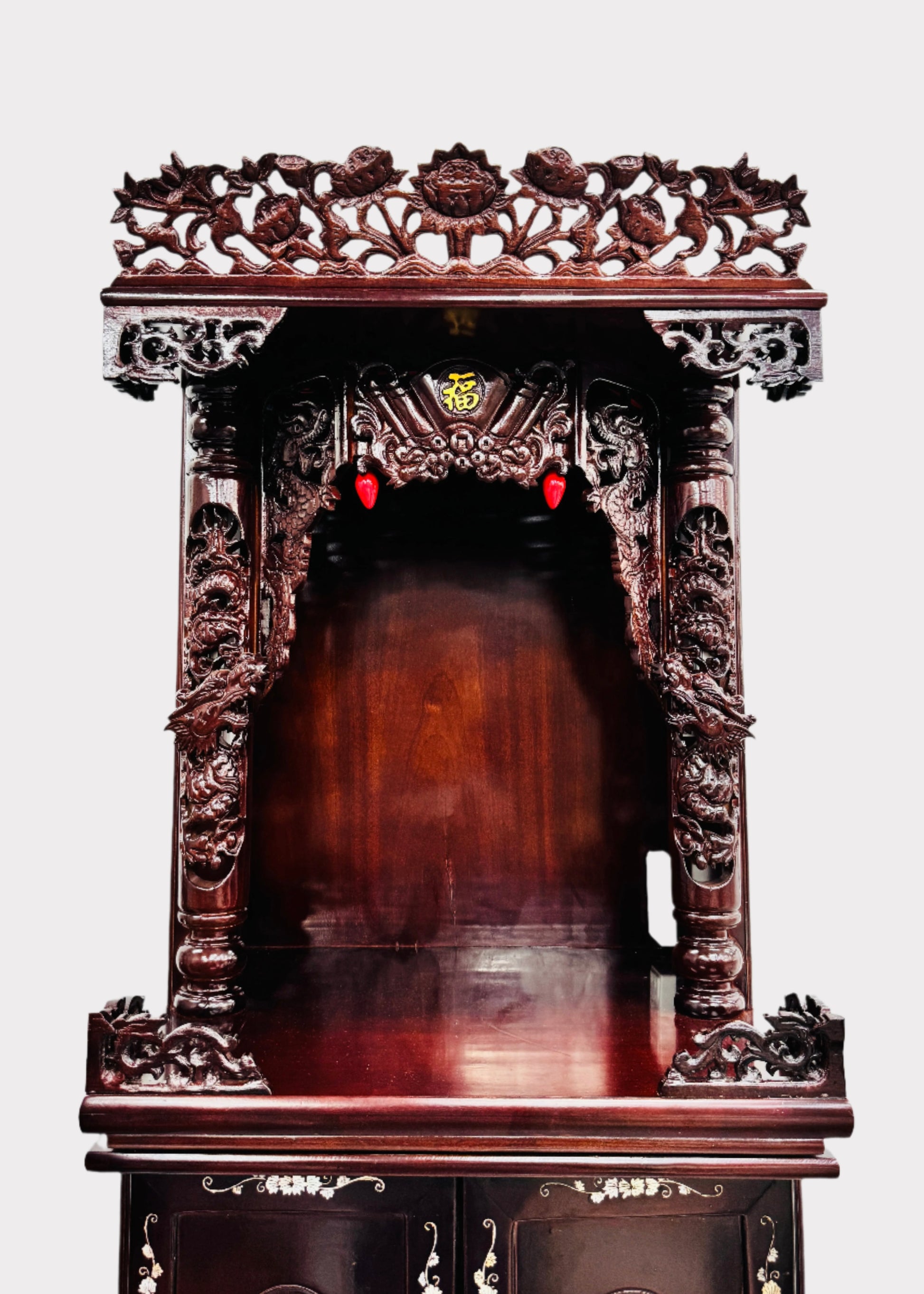 Adding to its majestic presence, the altar is adorned with intricately carved dragon columns on each side, symbolizing strength, protection, and divine power. These beautifully detailed columns enhance the altar’s traditional elegance while imbuing it with auspicious energy.