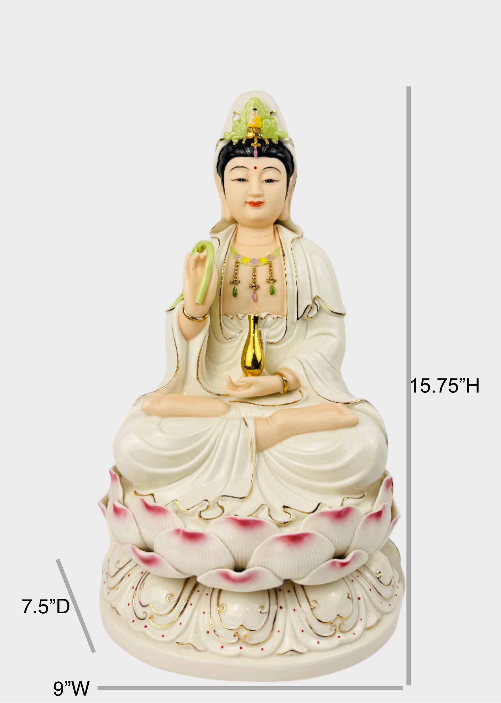Immerse your space in serenity and compassion with this exquisite hand-painted Guan Yin statue. Crafted from high-quality ceramic, this stunning piece features the Goddess of Mercy, gracefully seated upon a beautifully sculpted lotus, symbolizing purity, enlightenment, and transcendence. Her serene expression exudes peace and wisdom, making it an ideal addition to your altar or sacred space.