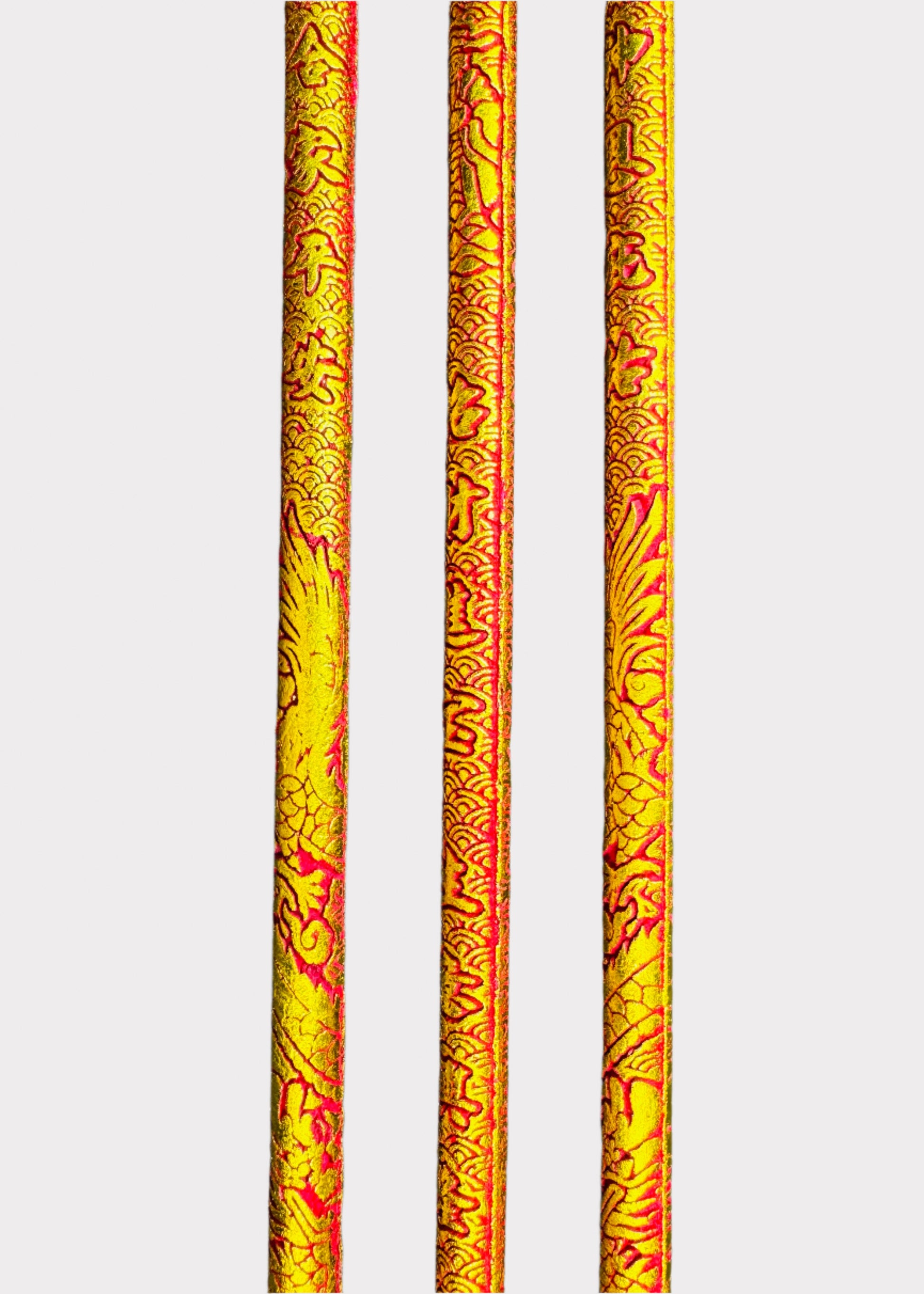 Golden Dragon Incense Sticks (2): The first two incense sticks are adorned with majestic golden dragons, symbols of strength, protection, and good luck. Each stick also features an inscribed good fortune saying, reinforcing the energy of prosperity and success in your space.