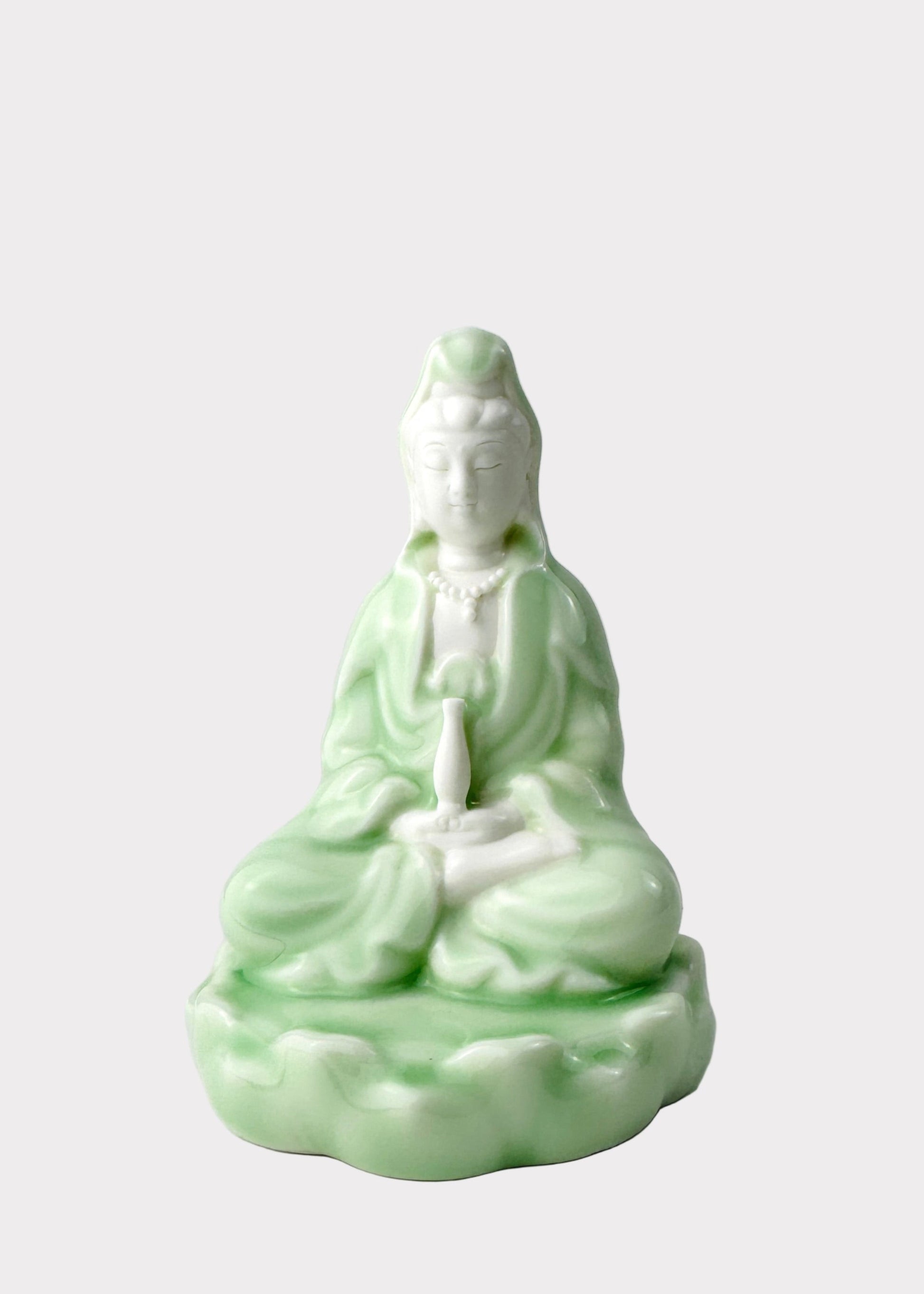 Graceful and serene, this porcelain Kwan Yin statue is crafted in a soothing celadon green glaze, symbolizing compassion, peace, and healing. Depicted in a meditative pose atop a lotus base, Kwan Yin holds a vase of pure water, representing mercy and blessings. The soft gradient from pale green to white enhances the figure’s delicate features and flowing robes, creating a calming presence for any altar, meditation space, or home décor.