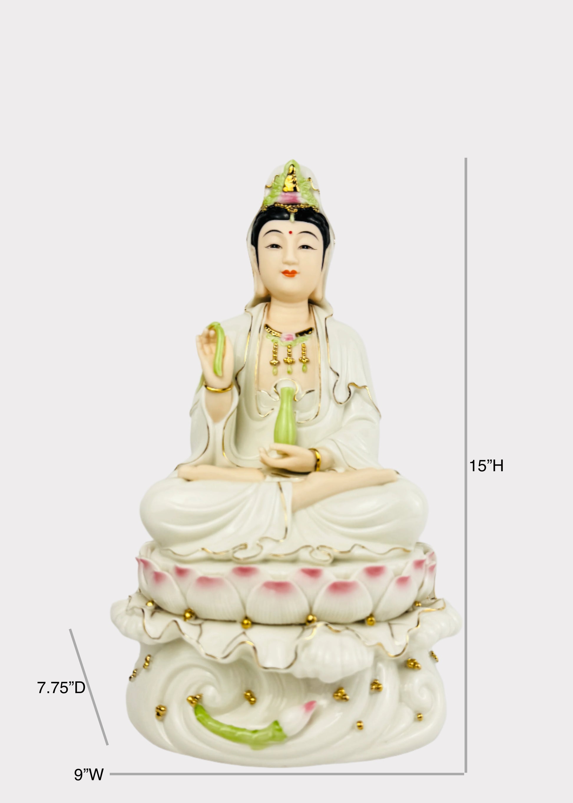 Invite tranquility and divine grace into your space with this beautifully hand-painted Guan Yin statue. Made from high-quality ceramic, this masterpiece showcases the Goddess of Mercy seated upon a delicately sculpted lotus, a timeless emblem of purity and spiritual awakening. Her serene expression radiates compassion, making her an inspiring presence for any altar or meditation space.