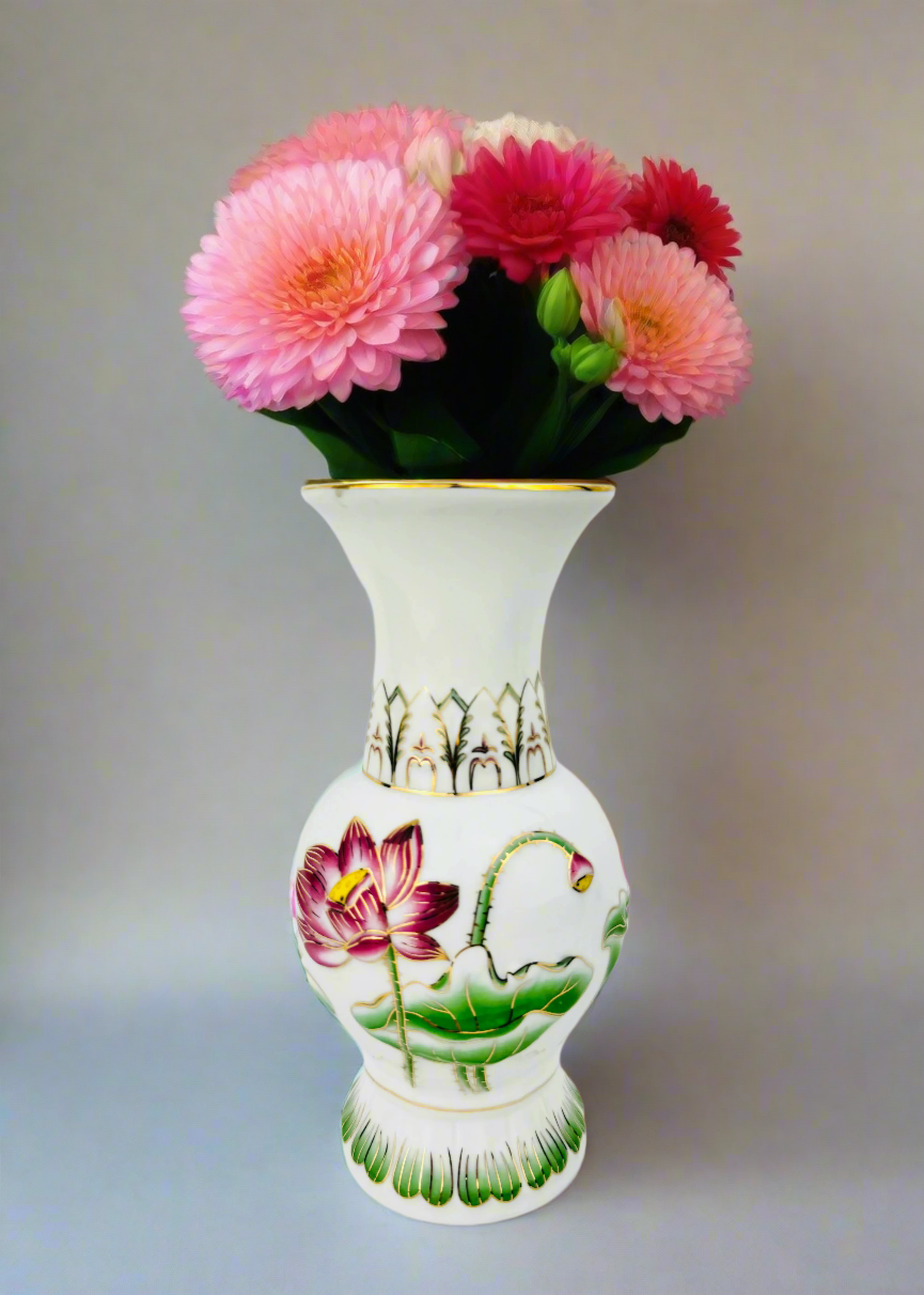 Infuse your altar with grace and tranquility with the Blush Lotus Altar Vase, a stunning piece designed for spiritual devotion and mindful offerings. Crafted from elegant pink ceramic, this vase features delicate gold outlines of lotus flowers and lily pads, symbolizing purity, enlightenment, and spiritual awakening. The soft blush hue enhances its soothing presence, while the radiant gold detailing adds a touch of sacred refinement. Perfect for holding fresh or dried flowers, incense, or sacred water, this handcrafted vase is a timeless addition to any ritual space or a thoughtful gift for those seeking peace and divine connection.
