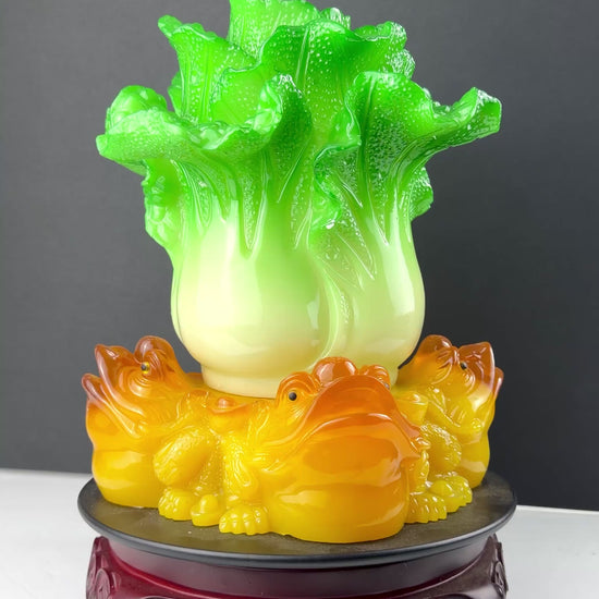 Bring prosperity and balance to your space with this rotating Feng Shui cabbage figurine, beautifully detailed in translucent green and gold tones. Resting on four golden wealth frogs, it symbolizes fortune flowing from all four directions, ensuring continuous abundance and harmony.