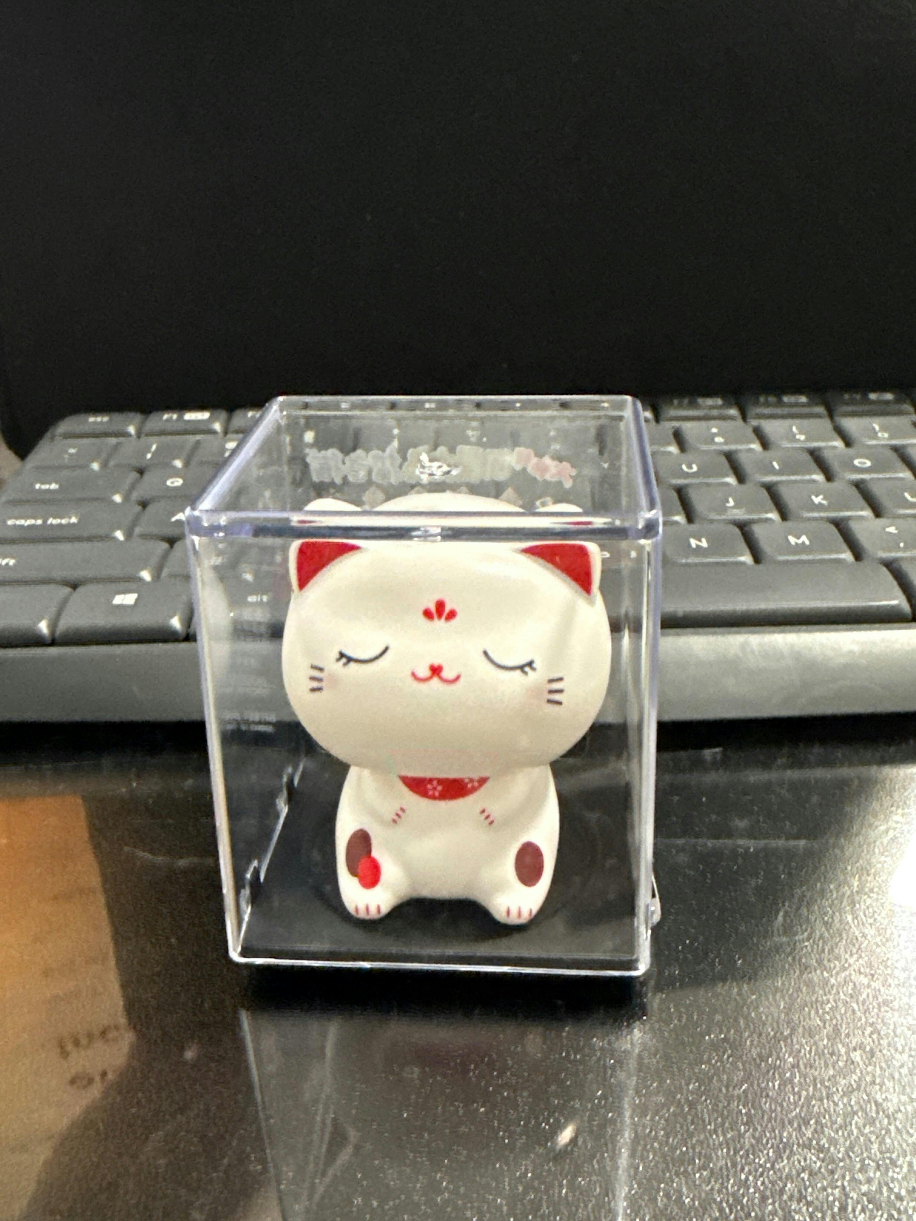 This white solar lucky cat is a delightful symbol of prosperity and charm. Crafted from lightweight plastic, it features a peaceful expression with eyes closed and a gently nodding head that moves when powered by light. Unlike traditional waving cats, this design offers a calm and serene energy while still carrying the symbolism of wealth and good luck. Since it runs entirely on solar power, no batteries are required, making it easy to place anywhere with natural or indoor light. Compact and eye-catching, it’s perfect for desktops, shop counters, car dashboards, or as a thoughtful gift for loved ones. This solar-powered nodding cat is believed to invite positivity, abundance, and happiness into any space.