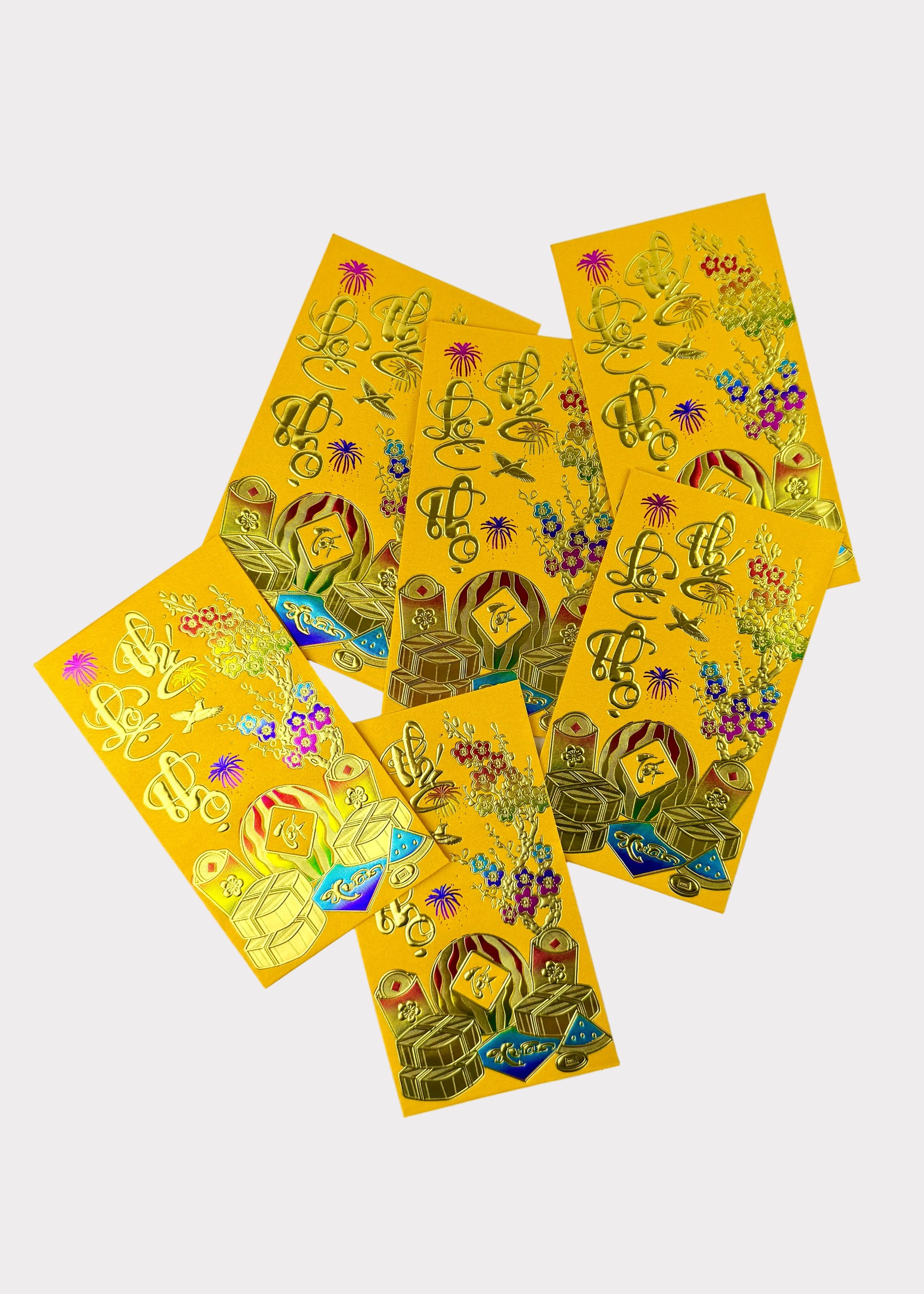 Each 6-pack contains six envelopes of the same design. The design you receive will be selected at random, adding a fun element of surprise while maintaining a cohesive, matching set for gifting. All designs share the same premium quality, textured gold foil embossing, and traditional Vietnamese New Year motifs symbolizing prosperity, happiness, and good fortune.