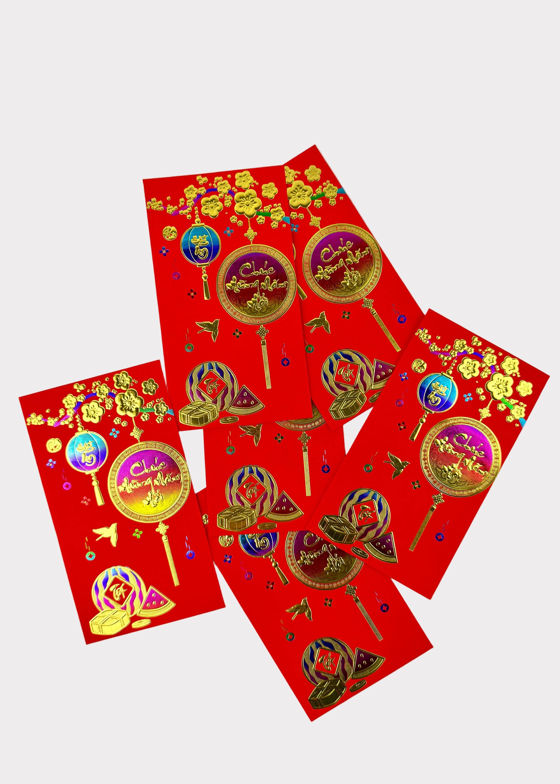 Celebrate Lunar New Year and Tết with these striking Vietnamese red envelopes, designed with vibrant red tones, ombre metallic accents, and raised gold foil press-on details. Each envelope features layered textures that shimmer beautifully under the light, creating a bold and festive presentation.