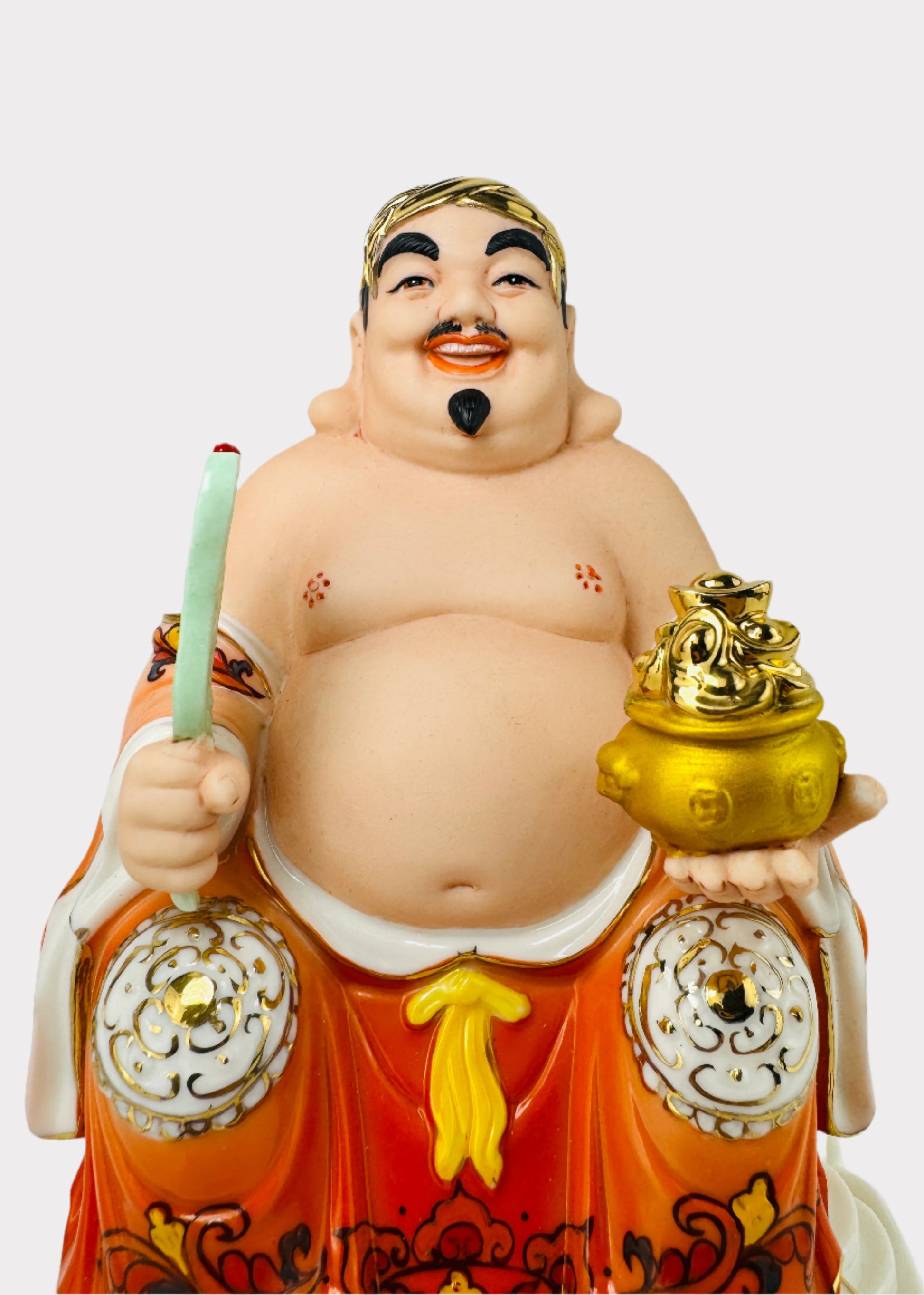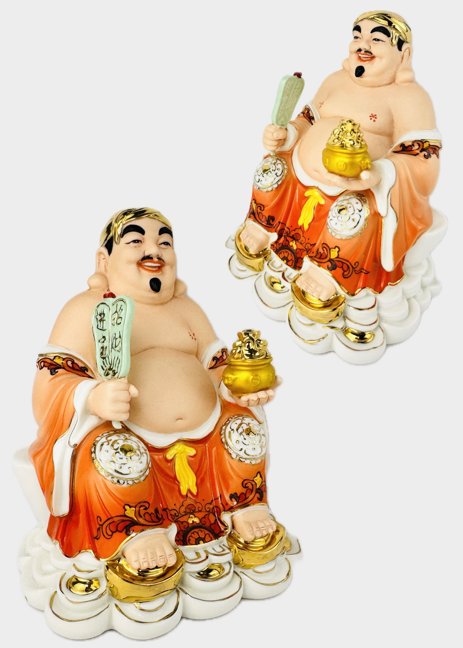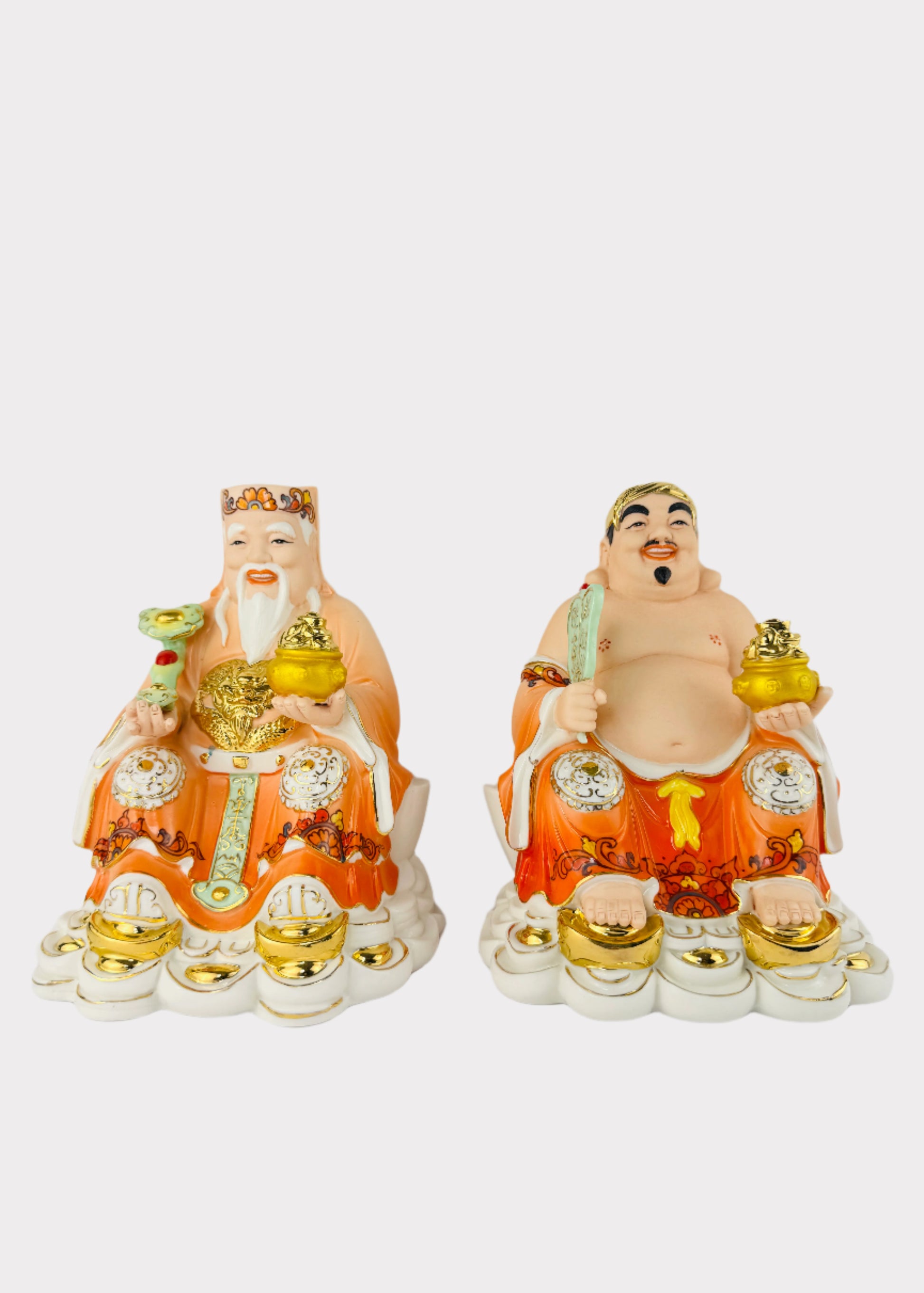Invite prosperity and protection into your home with this exquisite Ông Địa and Thần Tài statue set. Each statue is meticulously crafted from fine porcelain, featuring vibrant hand-painted orange-red robes adorned with intricate gold detailing.