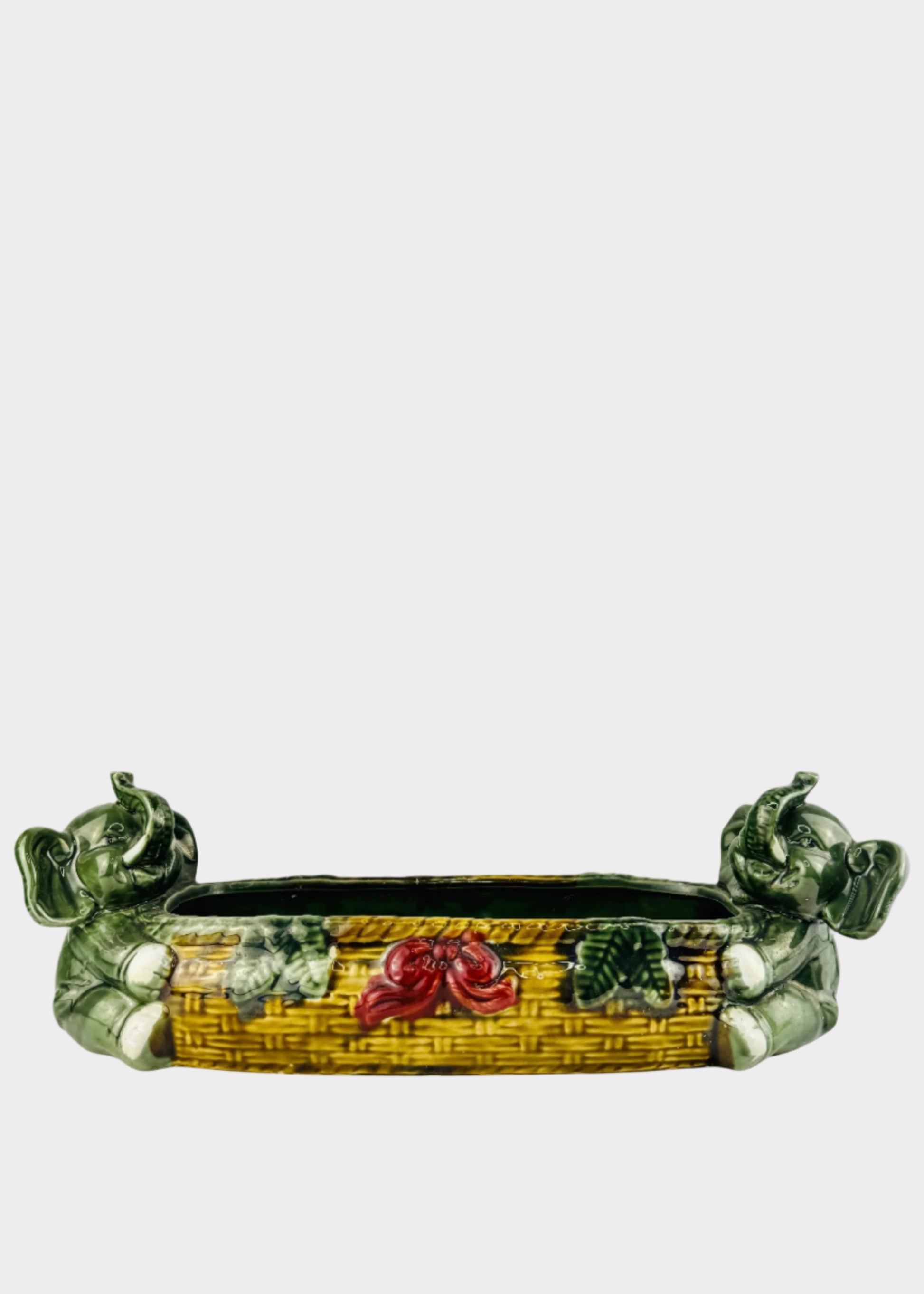 Bring charm and positive energy into your space with this unique ceramic planter. Featuring a beautifully crafted woven basket design in warm tan tones, this elongated, low-profile planter is adorned with joyful green elephants at each end—symbols of luck, wisdom, and protection.