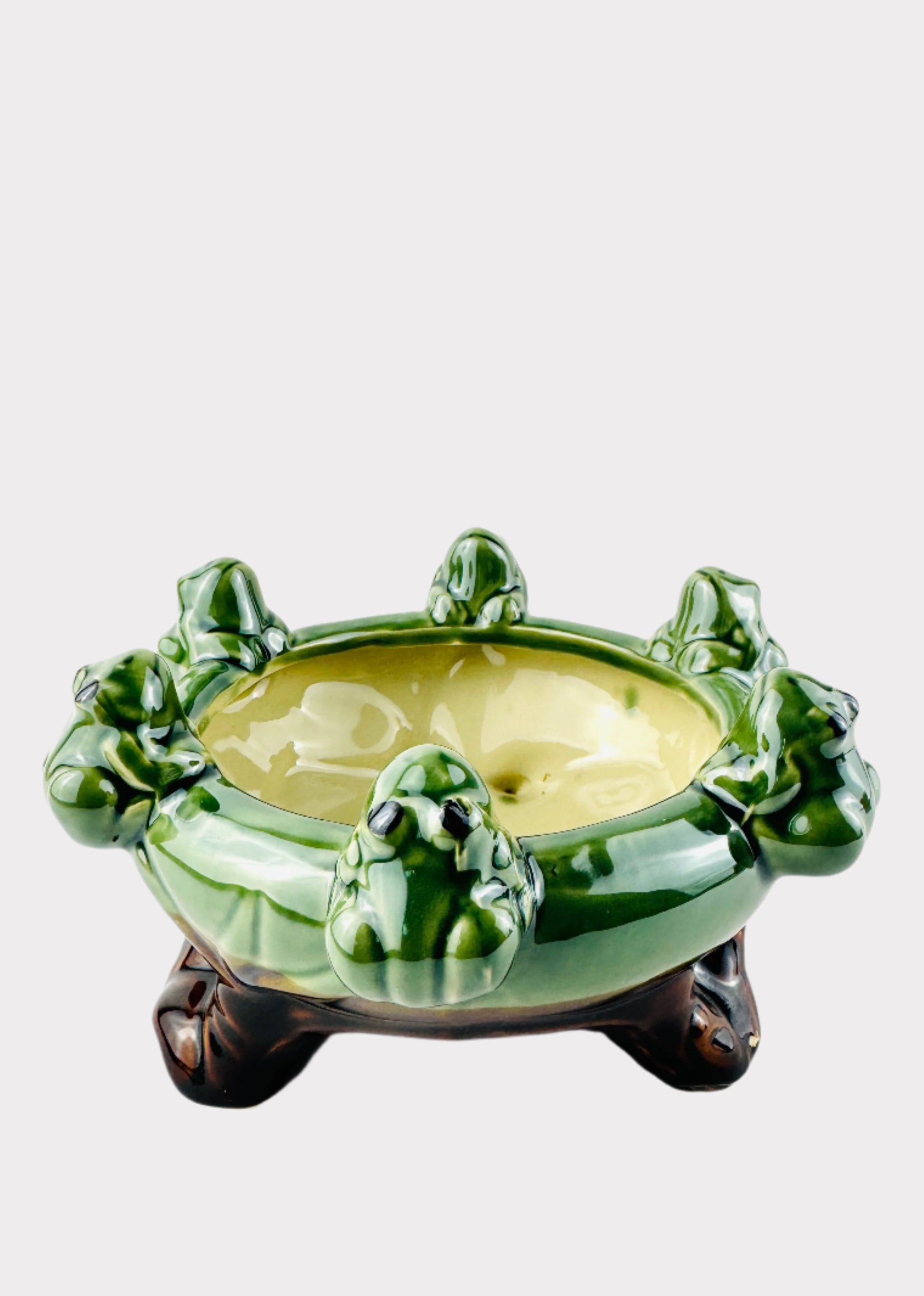 A beautifully crafted ceramic frog planter, perfect for growing bamboo. This unique bowl-shaped design features six charming frogs perched along the rim, symbolizing prosperity and good fortune. Supported by three branch-like feet, it blends nature-inspired artistry with practicality, making it a delightful addition to any space.